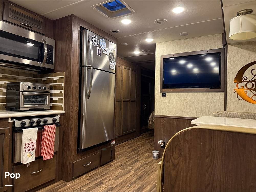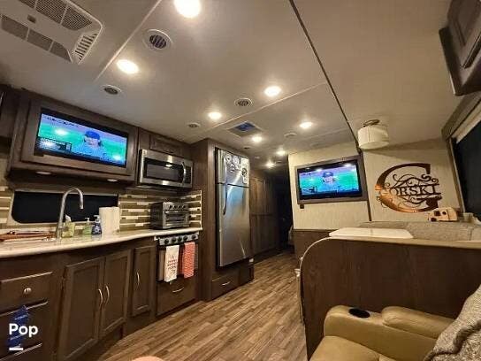 Relax on the 68" sofa/sleeper or at the large 73" x 42" U-shaped dinette/sleeper and enjoy the large flat screen TV. There is another flat-screen TV above the kitchen sink.