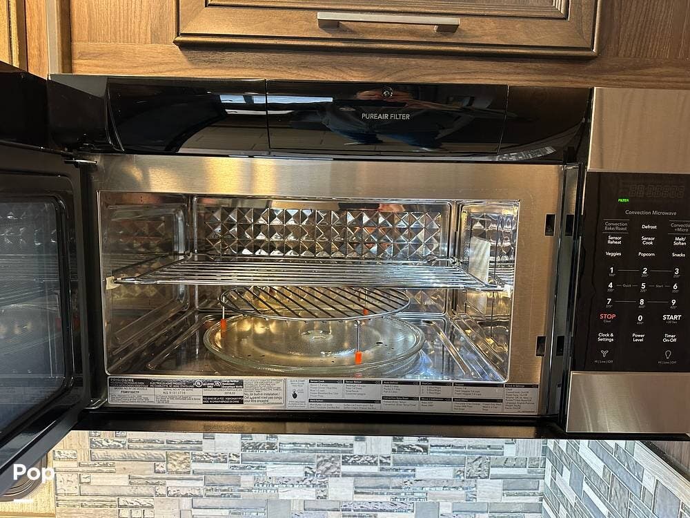 The kitchen is residential-grade, with a French-door refrigerator, convection microwave, and solid-surface countertops.