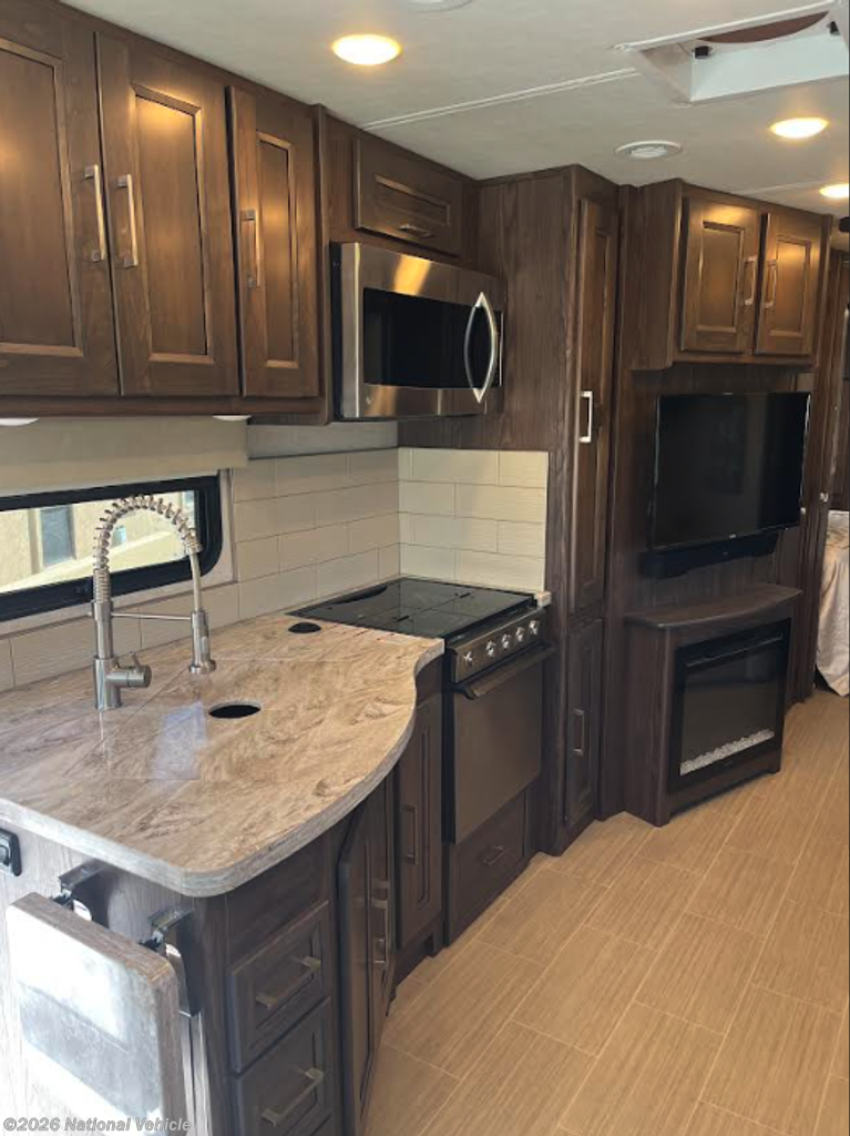 Inside, rich hardwood cabinetry, premium upholstery, and solid-surface countertops create an atmosphere of understated elegance. The expansive living area, enhanced by dual slide-outs, offers a seamless flow for entertaining or unwinding, while the cozy electric fireplace and ambient lighting add warmth and ambiance. The fully equipped kitchen rivals any luxury home, featuring stainless steel appliances, abundant counter space, and thoughtfully designed storage for effortless culinary experiences on the road.