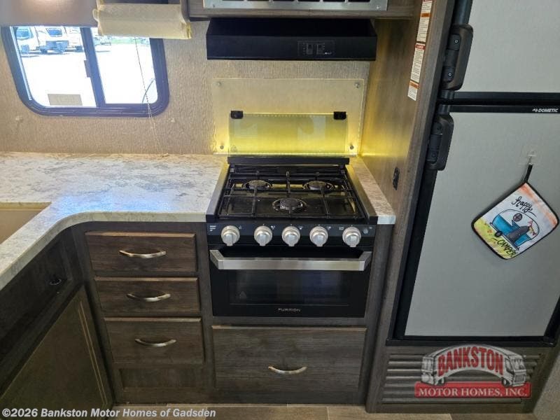 This travel trailer with a slide out and double bunk beds is perfect for your family of eight. You'll enjoy a front private bedroom with a queen bed and your own entry/exit door. Cook a meal with a three burner cooktop in this unit, and easily store all your dry goods in the pantry. The dinette is perfect for game night or you can relax on the sofa after a long day hiking. This travel trailer features a full bath with a tub for the little ones. You will love cooking hamburgers and hot dogs using the outside kitchen as you all enjoy time outdoors under the power awning. This model also includes a walk-in closet just as you enter the trailer for your shoes and jackets.