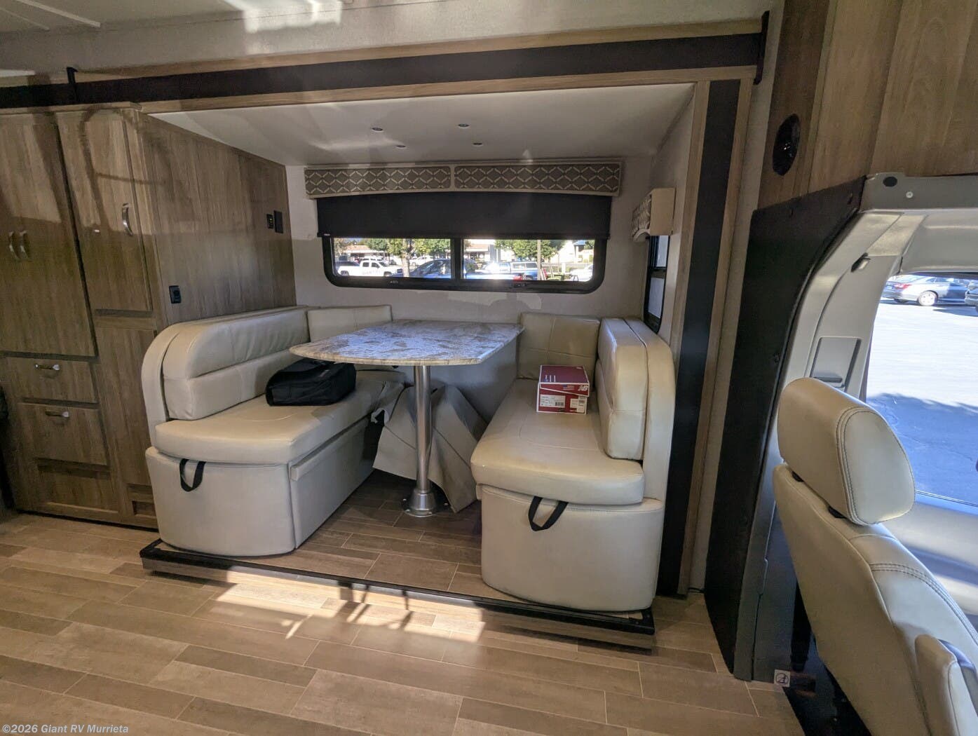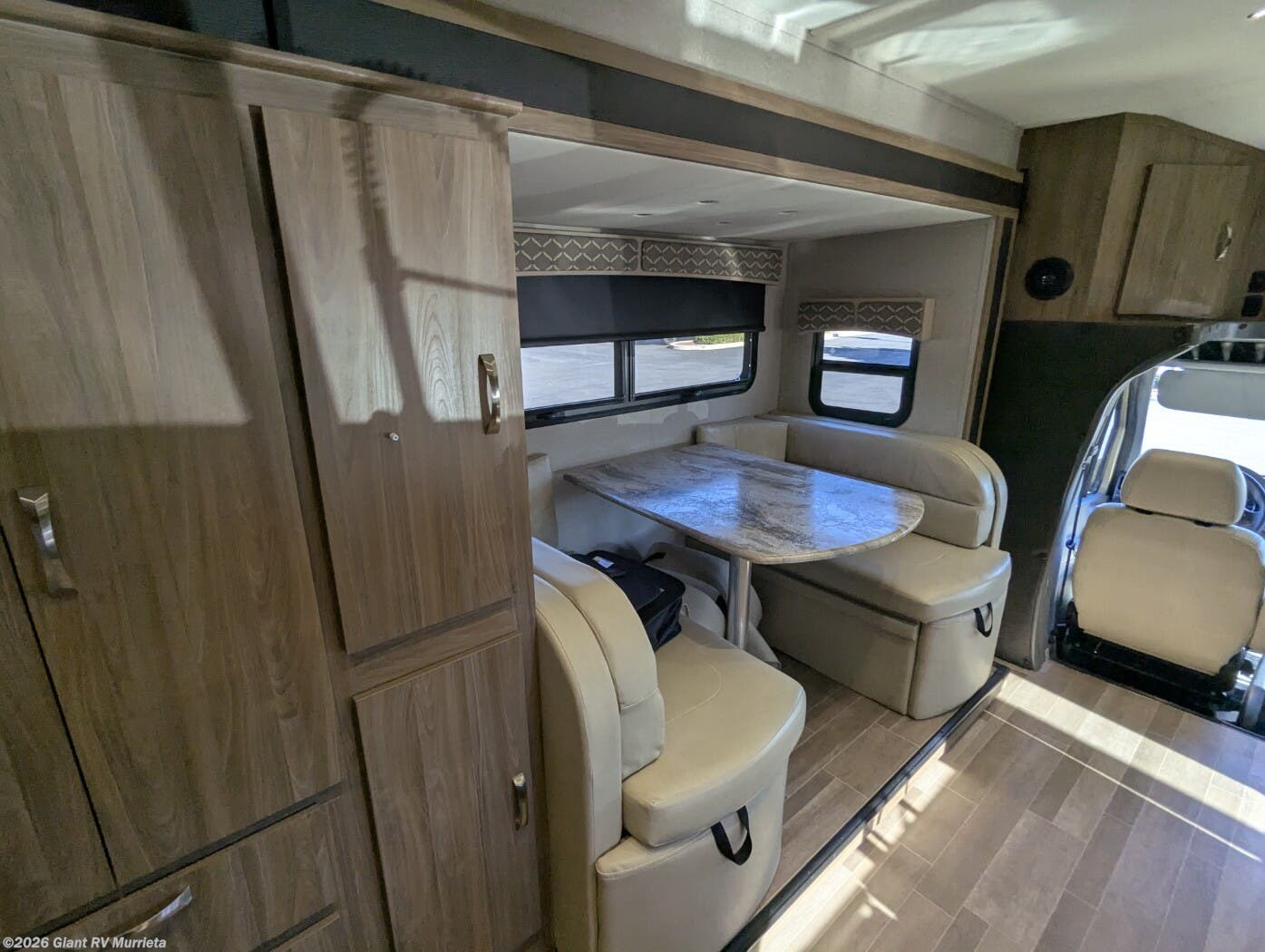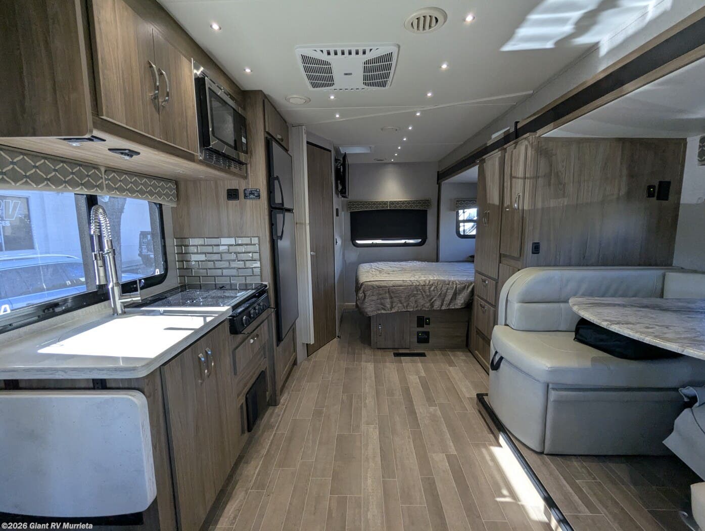 - Premium Kitchen & Lounge with solid-surface countertops, convection microwave, residential-style cabinetry, and a large dinette that converts for additional sleeping capacity.
