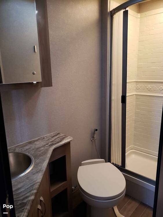 Inside, you'll find upscale finishes throughout: solid surface countertops, stainless steel appliances, a convection microwave, and a large refrigerator. The cab-over bunk, queen-sized bed, and convertible dinette offer sleeping space for up to 5 people, while the full bath with a glass-door shower provides home-like comfort.