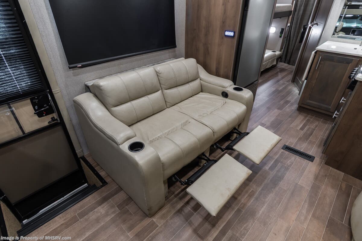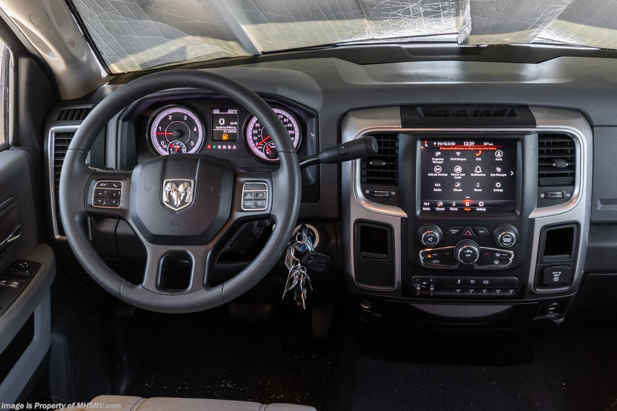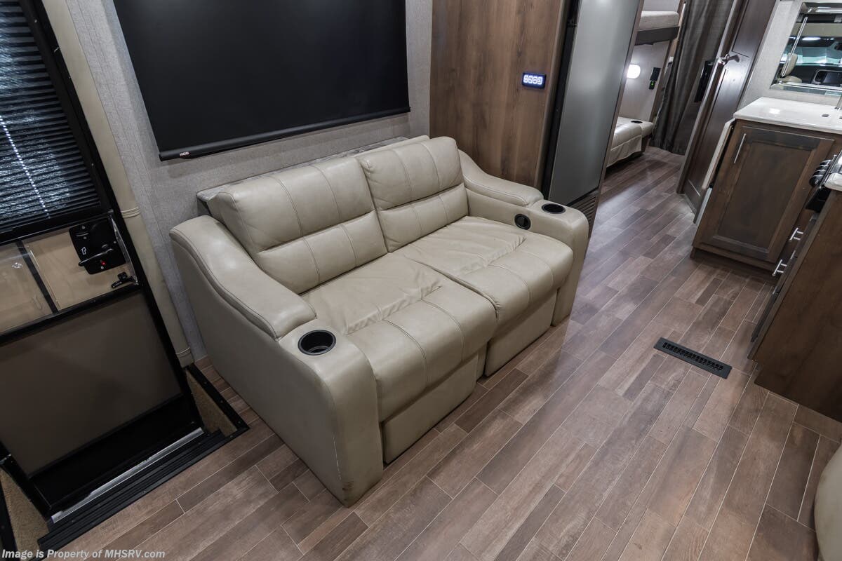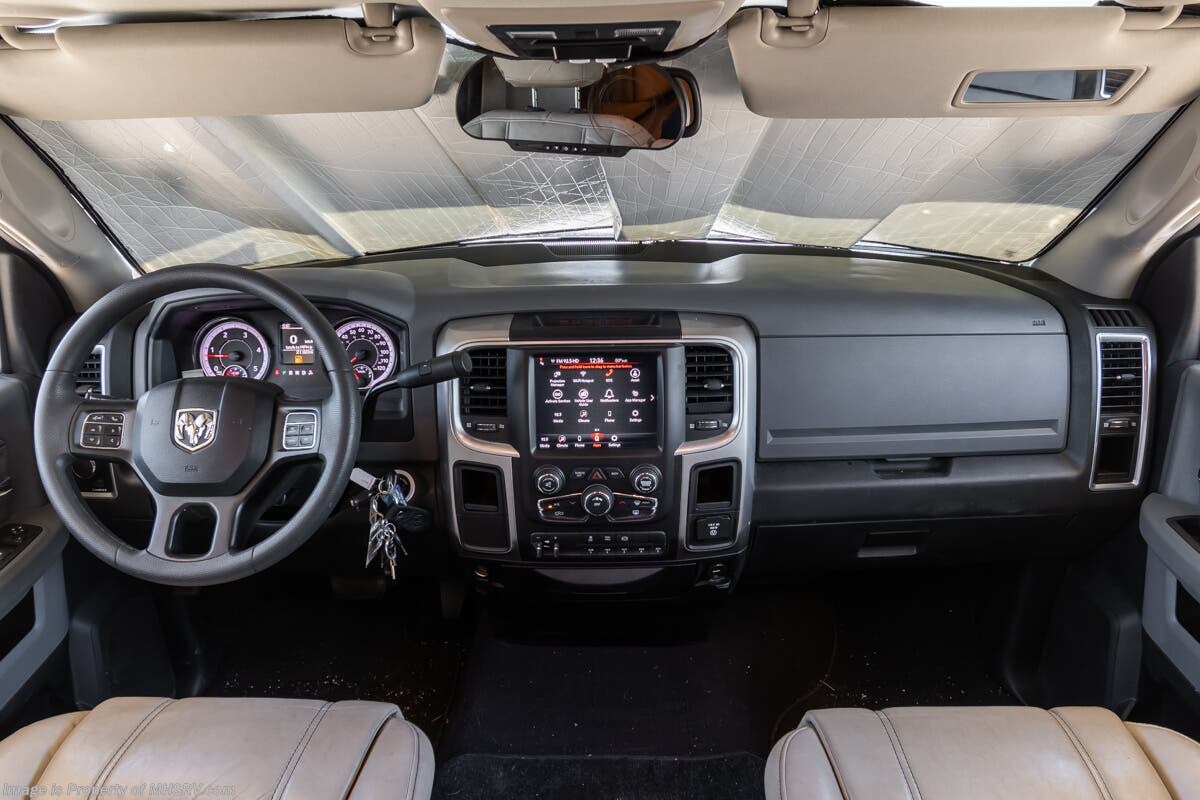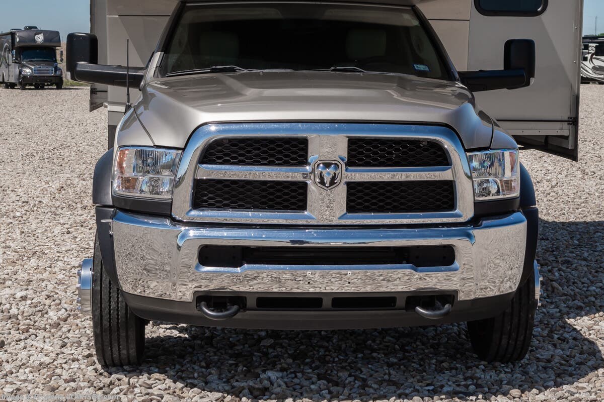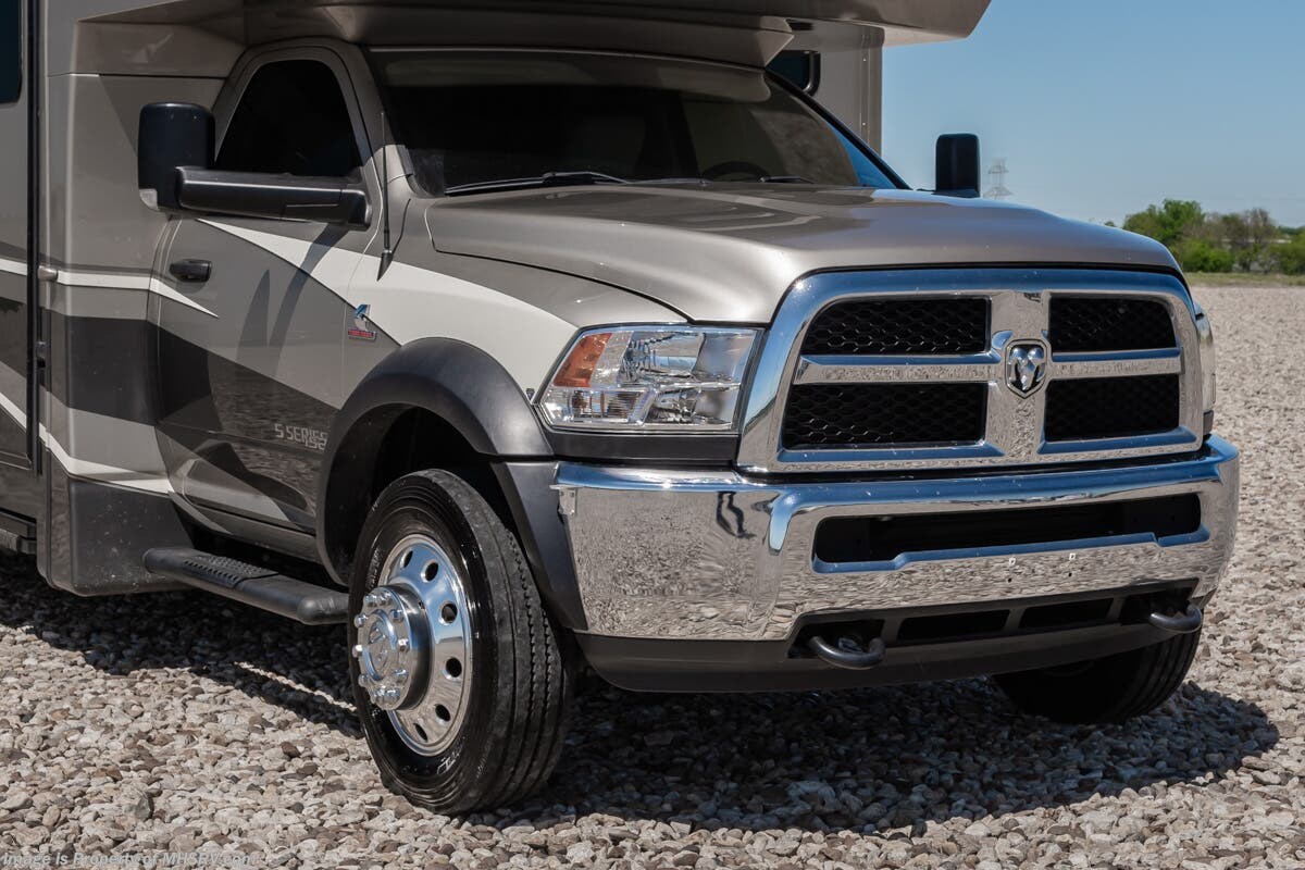 More About This RV This RV features aluminum wheels, equalizer systems hydraulic leveling, full body paint, 3 camera system, diesel generator, Cummins 6.7L diesel engine, Dodge Ram Chassis, dual A/C's, smart wheel, secondary exhaust brake, GPS, keyless entry, cruise control, water manifold, patio awning, door awning, pass through storage, LED running lights, docking lights, black tank flush, exterior shower, exterior TV, clear paint mask, fiberglass roof, solar, inverter, lithium batteries, multi-plex control panel, residential refrigerator with ice maker, 3 burner gas range, solid surface counter, theater seats, overhead loft and much more