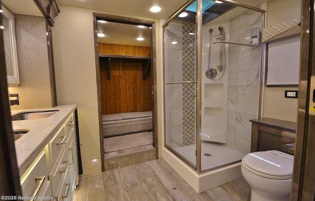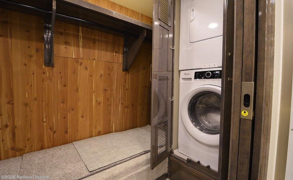 450 HP Cummins Diesel, 6 speed Allison Transmission, 12.5 KW Onan diesel generator, 1.5 baths with walk-in shower and dual sinks in master, three Girard power awnings that run the length of the passenger side, Aquahot 450 water heater (diesel and electric), three heat pump/AC units, day and night electric blinds on all windows, walk-in closet, washer, dryer and dishwasher, Solar, two burner induction cooktop, convection microwave, firefly electronic controls for most electrical features, rear and side cameras, slide toppers, LED's, blind spot monitors, and more.
