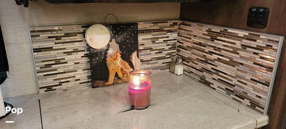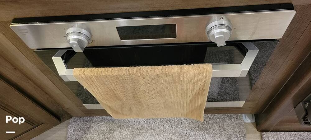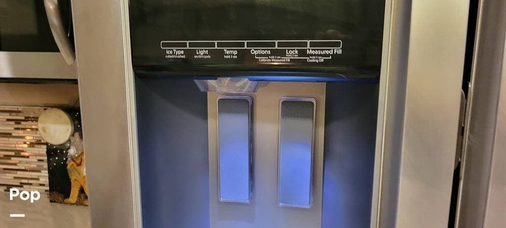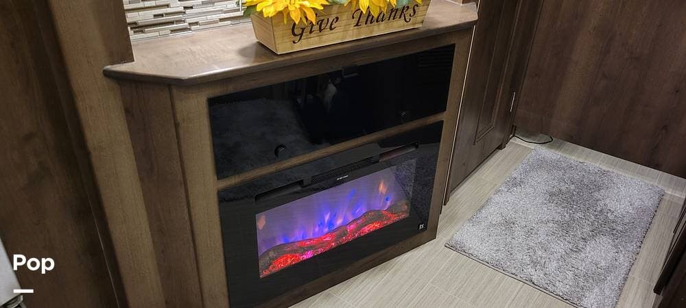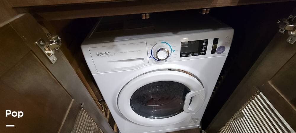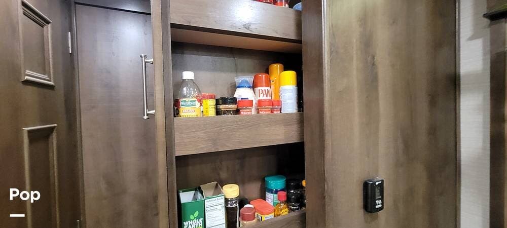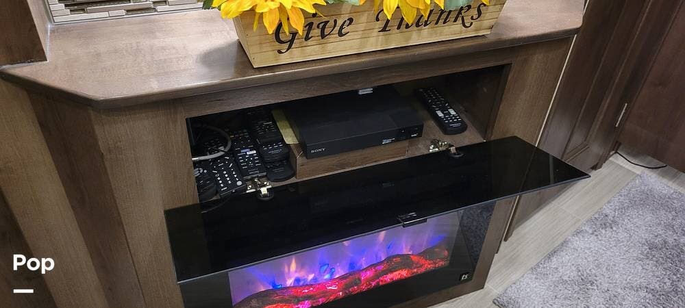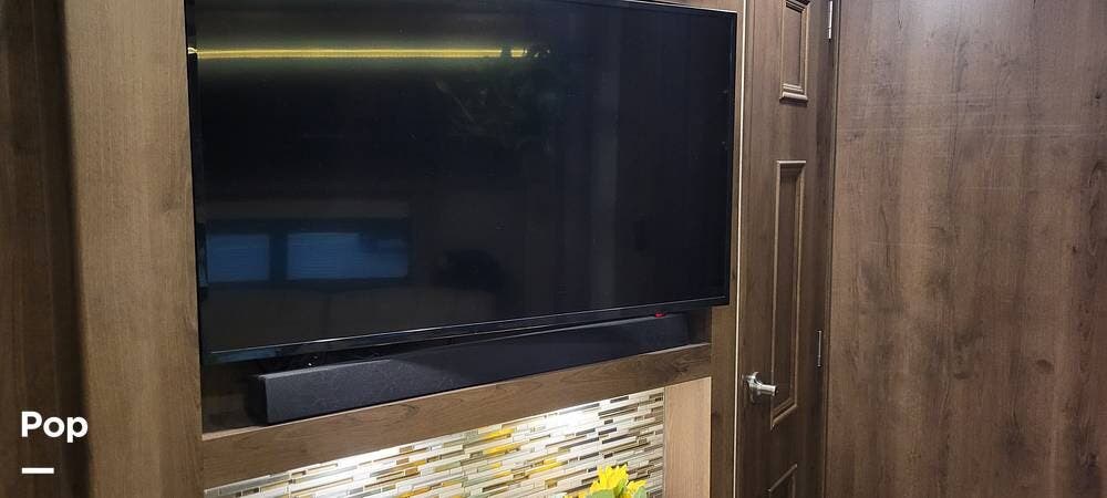 Outside, you can enjoy the exterior entertainment center with an LED TV on a swivel bracket, with nice stereo speakers under the 17-foot patio awning. This coach even has heated side mirrors, insulated bins and bin doors, a custom paint job, a mobile app for all of your main coach controls, and a full cover with the wheel and front and side window covers. You'll keep her looking great for years to come!