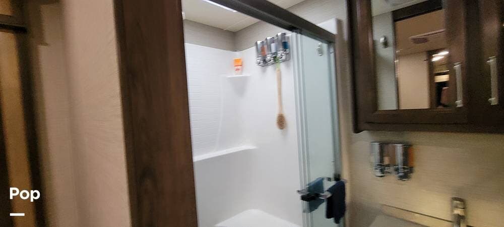 In the rear of the coach is a full bathroom with a large walk-in shower, sink, toilet, and plenty of storage for towels and supplies. There is also a half bath on the front side of the master bedroom, so you won't need to wait your turn for the bathroom.