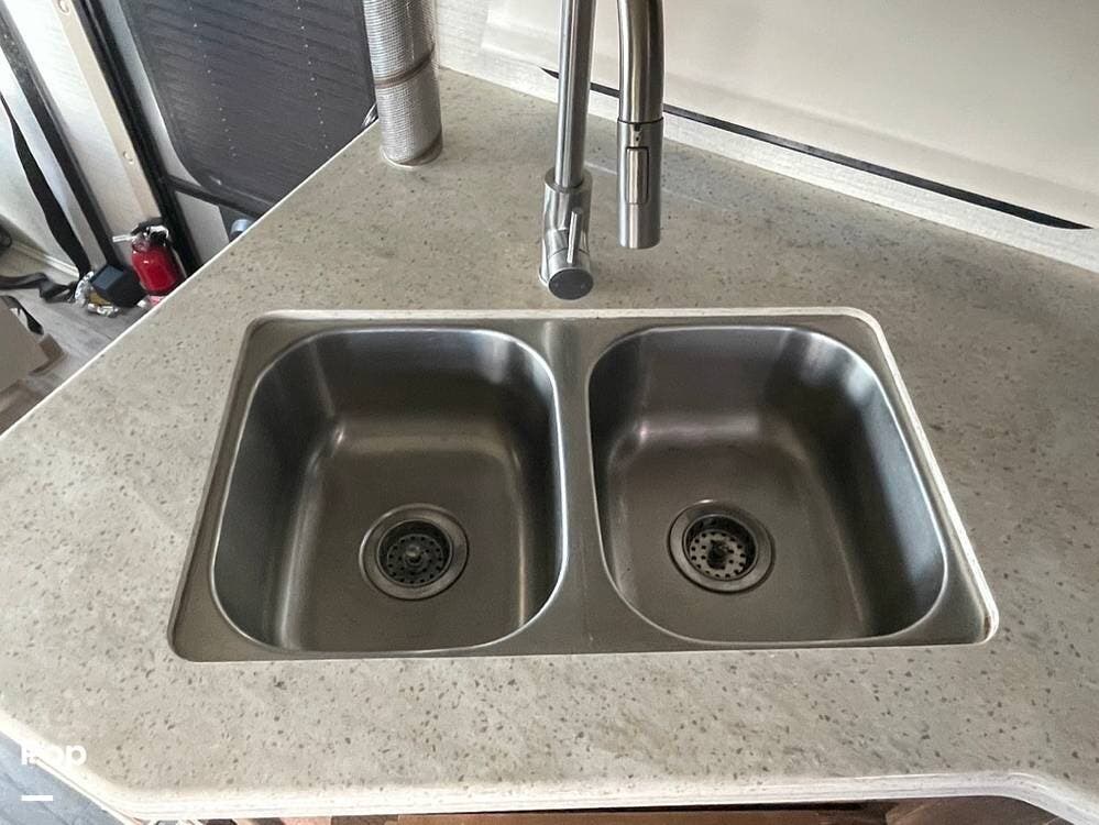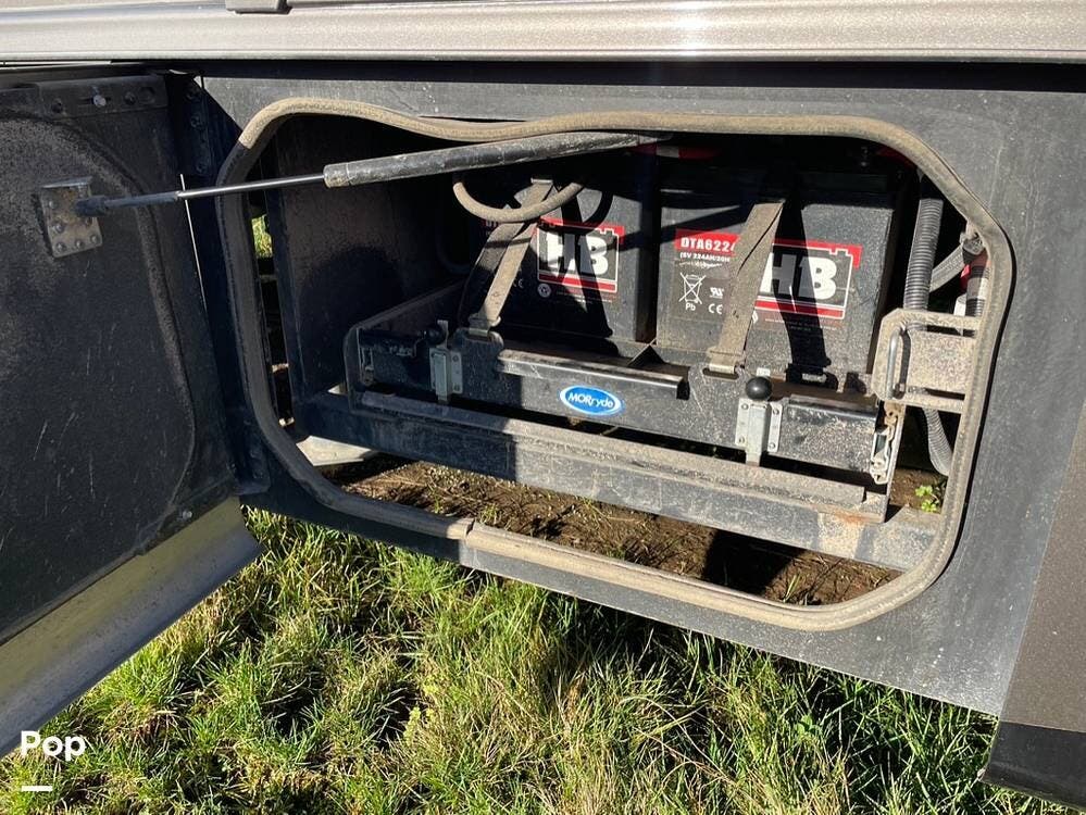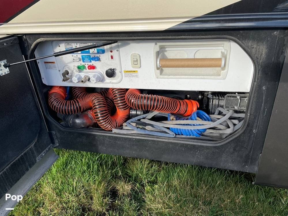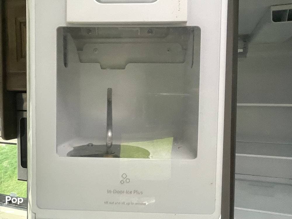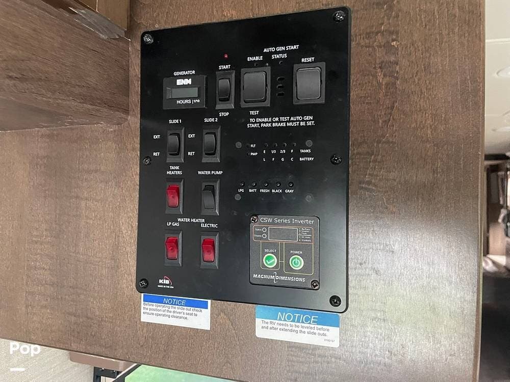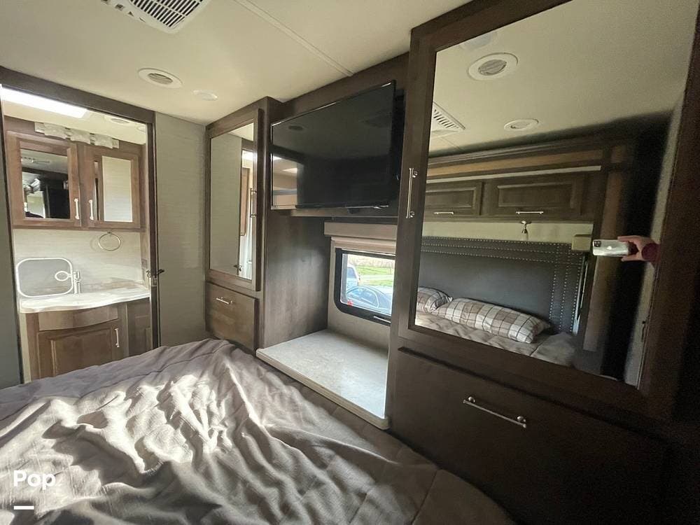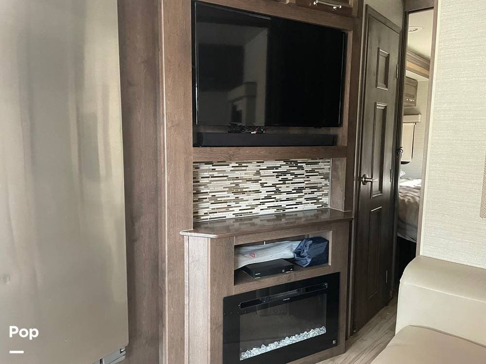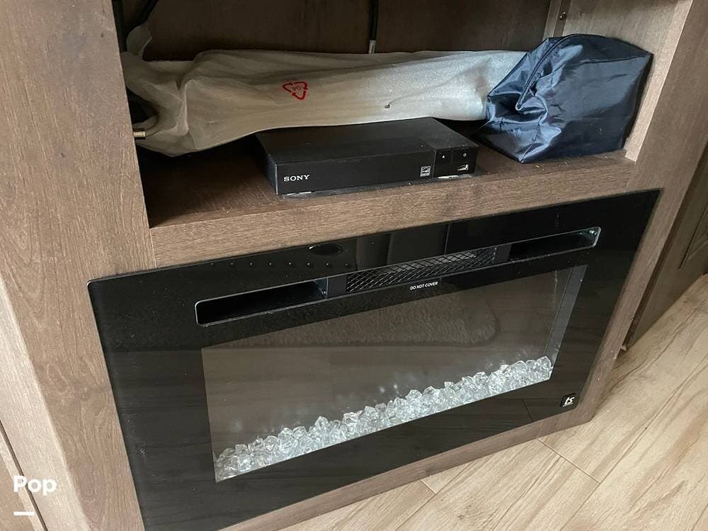 Entertainment options include multiple TVs, including one in the living area, one in the bedroom, and an exterior TV for outdoor viewing. A built-in sound system provides quality audio throughout the coach. The electric fireplace in the living area adds warmth and ambiance.