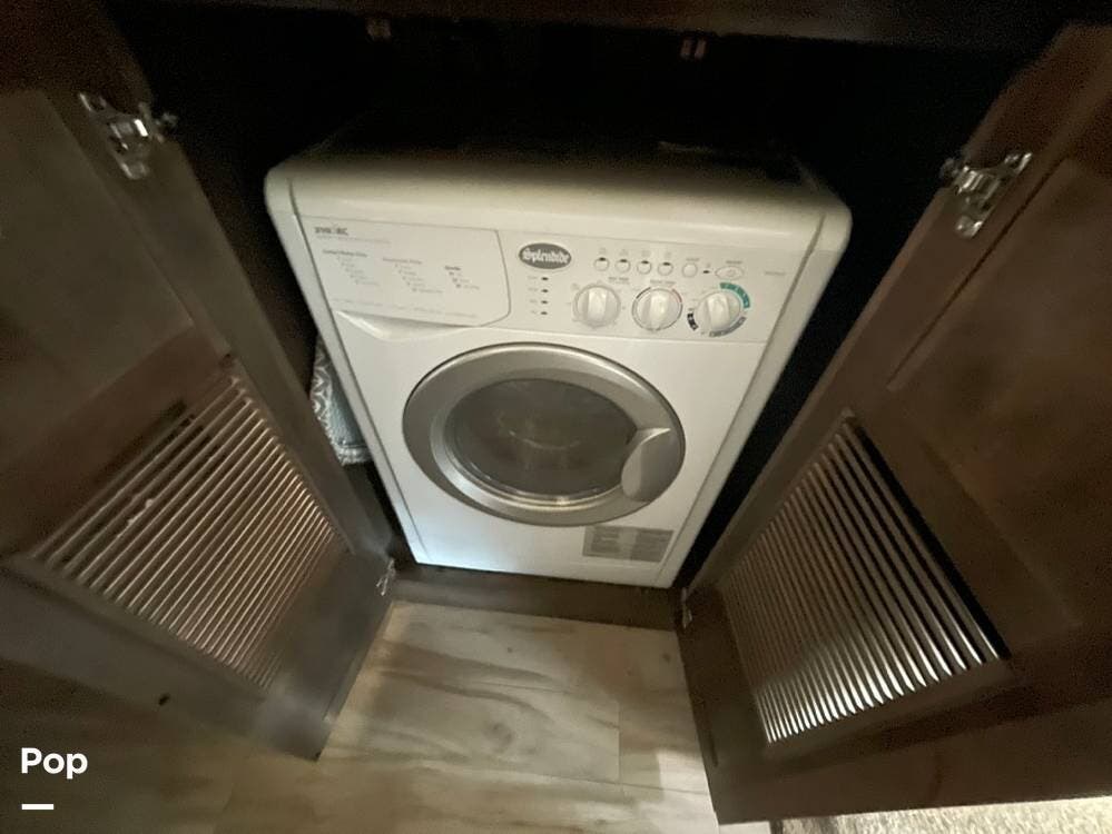 The bedroom includes a king-size bed with storage underneath, nightstands on either side, and overhead cabinets. A large wardrobe and dresser provide ample storage for clothing and personal items. There is also a washer and dryer combination for added convenience.