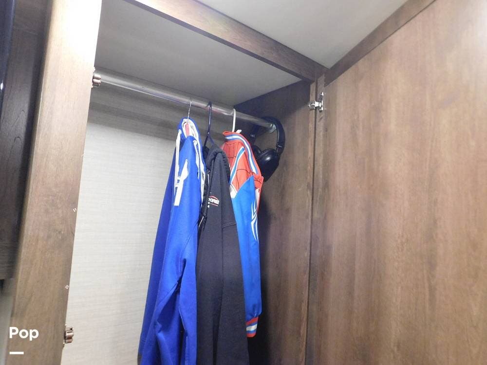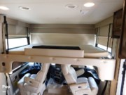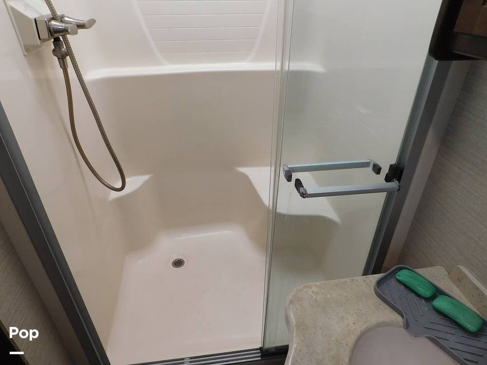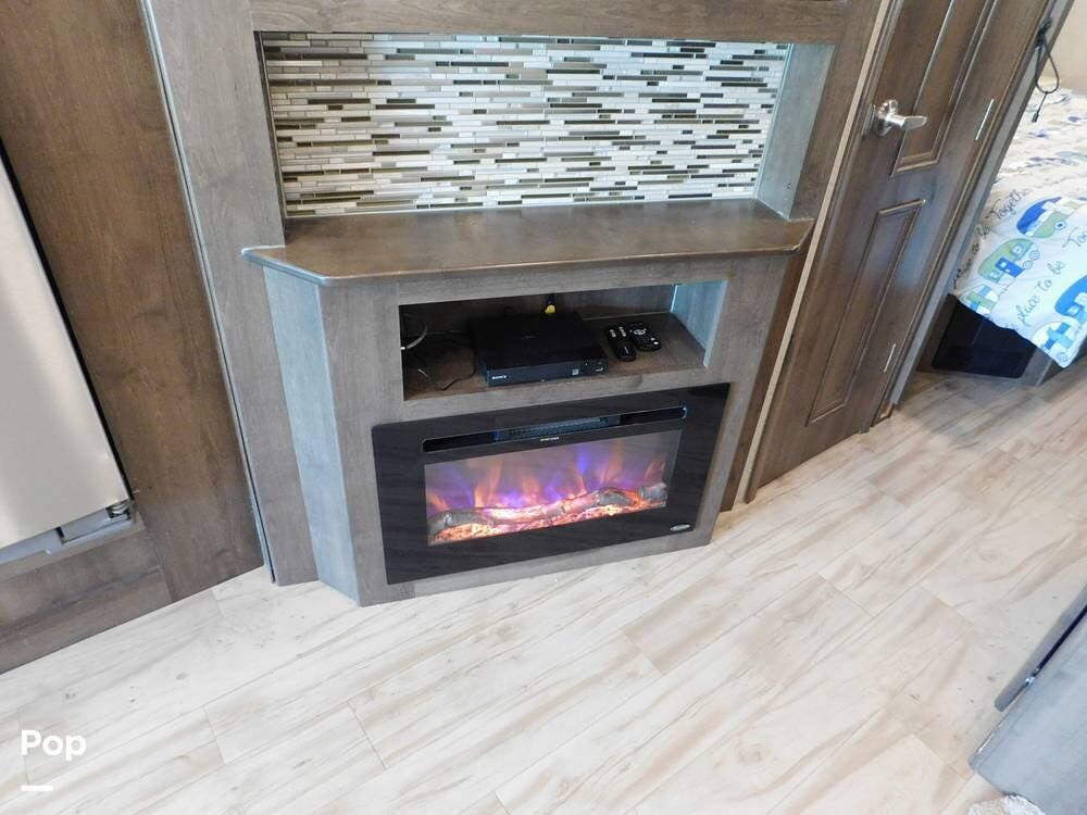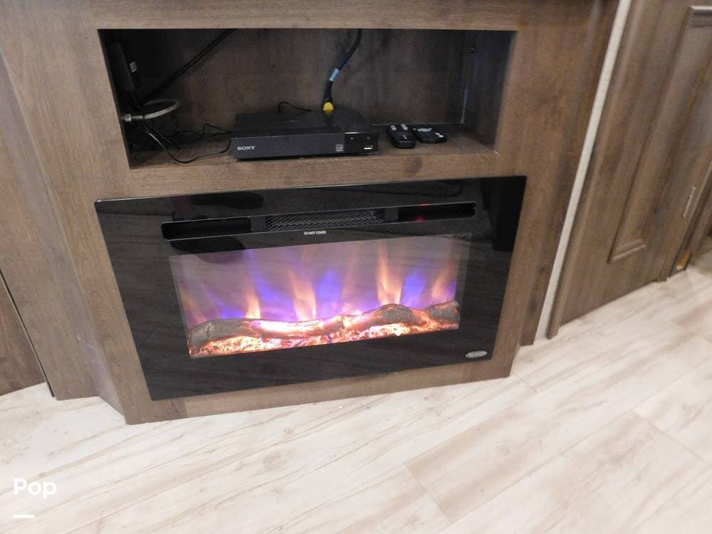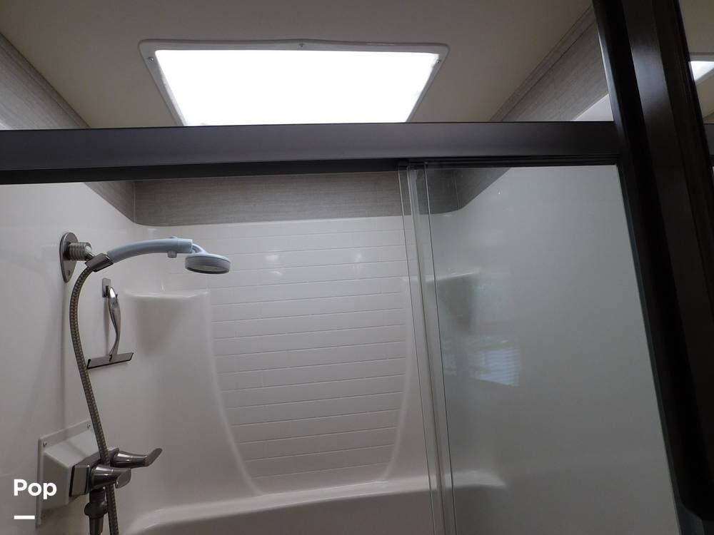 It has a bath and a half. In the back - the master has a king bed and TV, and in the front is the drop-down overhead queen bunk bed. The convertible dinette has seating for 4, as does the convertible expandable L lounge. The lounge has views of the fireplace and a large TV. There is LED lighting throughout.