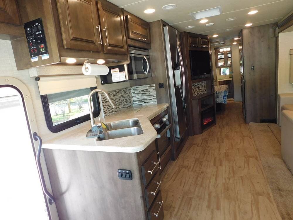 For power, it has the popular Ford V10 6.8L engine, an Onan generator for boondocking, and two roof-top ACs for cool. There is also a 2000W inverter.