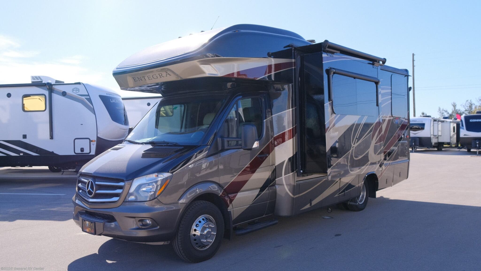 **Entegra Coach Qwest 24K Class C Diesel motorhome highlights:** * Two Slides * Private Bedroom * Sleeps Five * 14' Electric Awning with LED Lights * Recessed LED Ceiling Lights Traveling the country in this Qwest Class C Diesel motorhome is the best decision you could make for your next adventure with the family. Because this model has a rear, private bedroom with a queen-size bed, you will feel as if you are sleeping in your own home each night. The two slides add extra room in the living areas so that you don't feel as crowded when gathering together in this motorhome, and the exterior pass-through storage adds extra space so that your luggage isn't crowded either. And with a 2-burner cooktop and 6 cubic foot refrigerator located in the kitchen, no one will complain when it comes time for supper because you will be able to prepare everything the way that you always have. With this Entegra Coach motorhome, you will be able to experience luxury like never before with indulgent amenities like the high-intensity, recessed LED ceiling lights which add an extra touch of ambiance to the entire coach, and from the moment you step foot into this unit, you will notice the woven vinyl flooring that brings the entire decor scheme together in an elegant fashion. During the day you can adjust the level of sunshine you want streaming into this unit with the help of the day/night roller shades that are included on all of the windows throughout this model, and if you prefer to spend your evenings outdoors gazing up at the night sky, then you can comfortably do so underneath the electric awning with LED lights.
