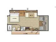 There is a queen-size bed with storage cabinets above the bed and a storage cabinet beside the bed. There is also a place for a TV to be added.