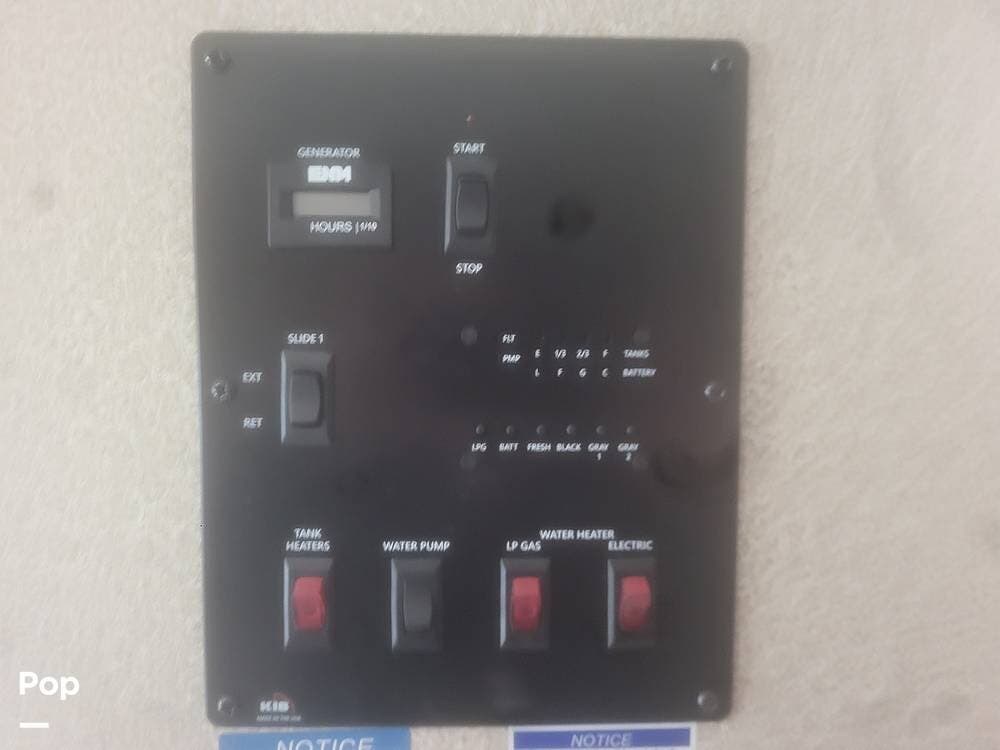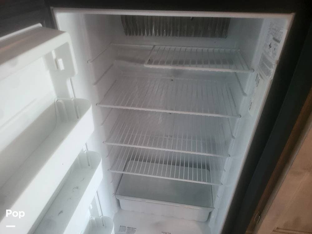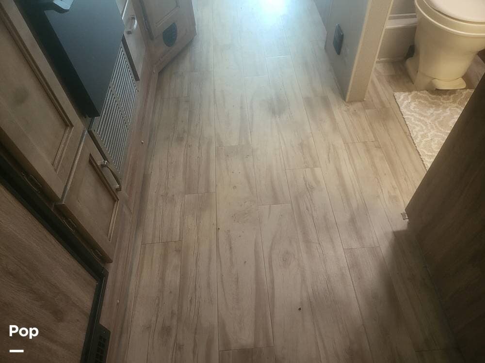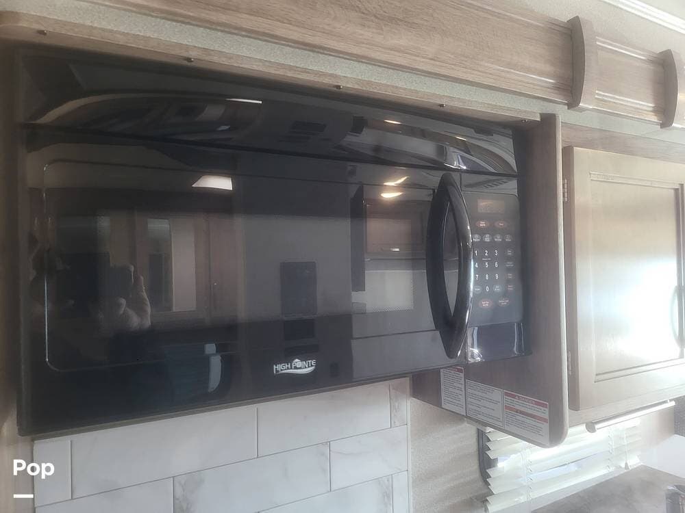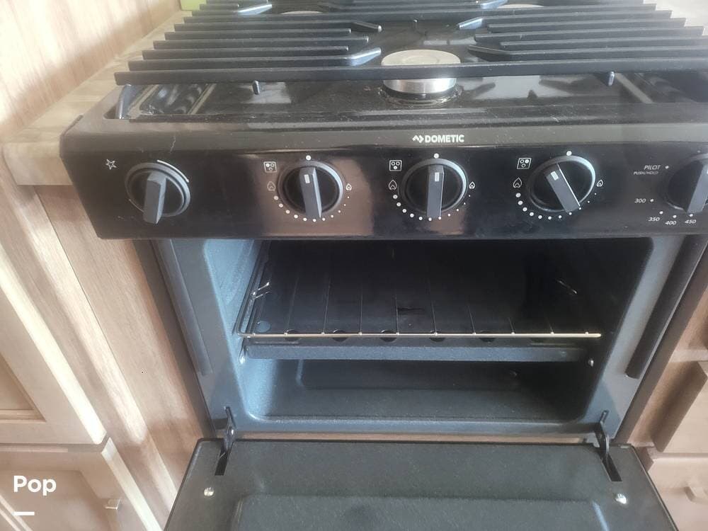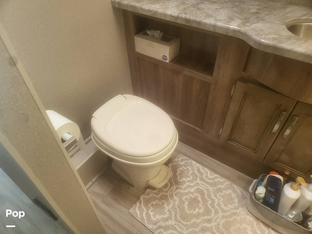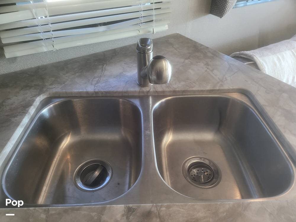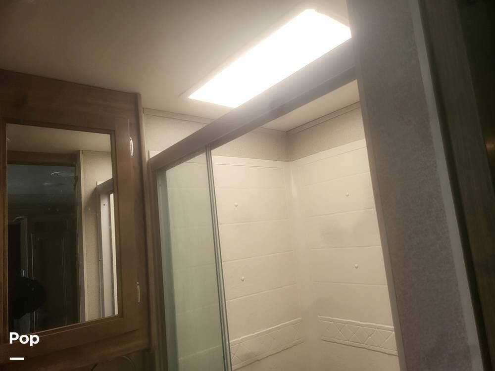 The twin 11,000 BTU air conditioning units, central heat, and ceiling power vents keep the RV comfortable year-round.