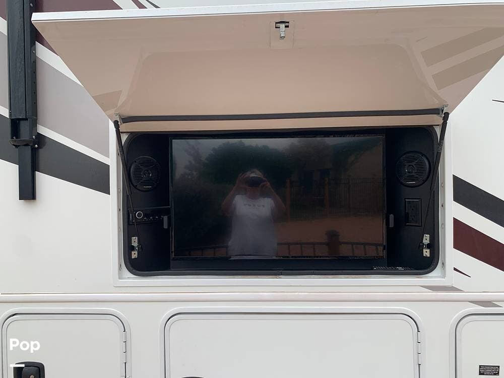 An electric patio awning with LED lights extends to create an inviting outdoor living area, complemented by an exterior entertainment center with an LED TV mounted on a swivel bracket, and a DVD/AM/FM radio with speakers.