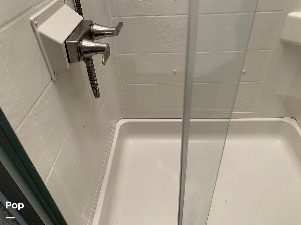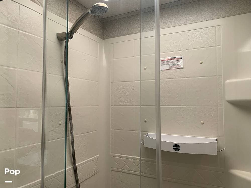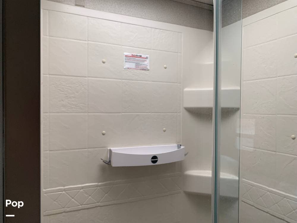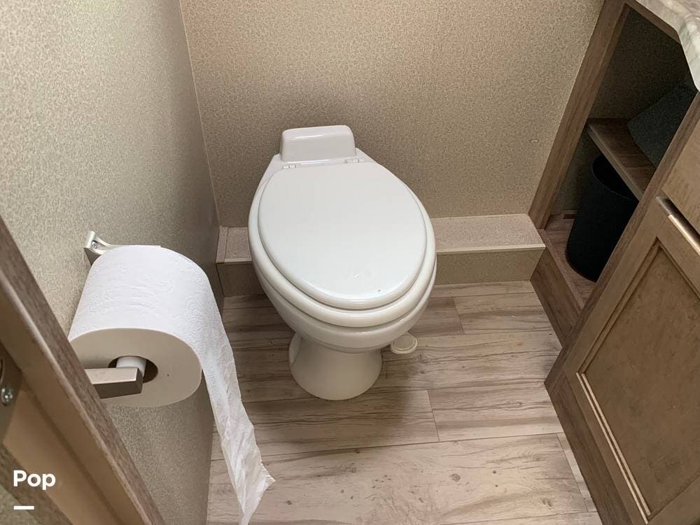 The private rear bedroom houses a queen-size bed (with elevated, turned option and storage underneath) and a bedroom LED TV. The bathroom includes a shower with a glass door, skylight, and light, a porcelain toilet with a foot flush, and a powered roof vent.