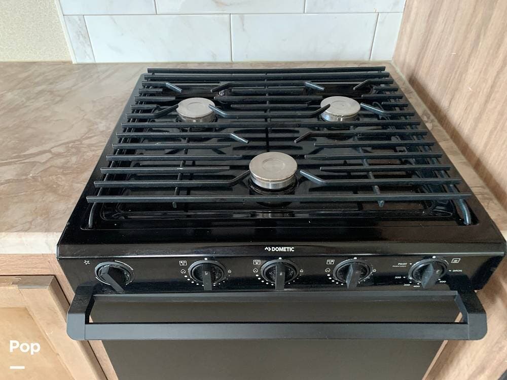 The kitchen is equipped with pressed countertops, a large double-bowl stainless steel sink, a three-burner range with an oven and piezo igniter, and a 1.6 cu. ft. microwave. An 8 cu. ft. gas/electric refrigerator .