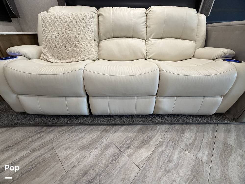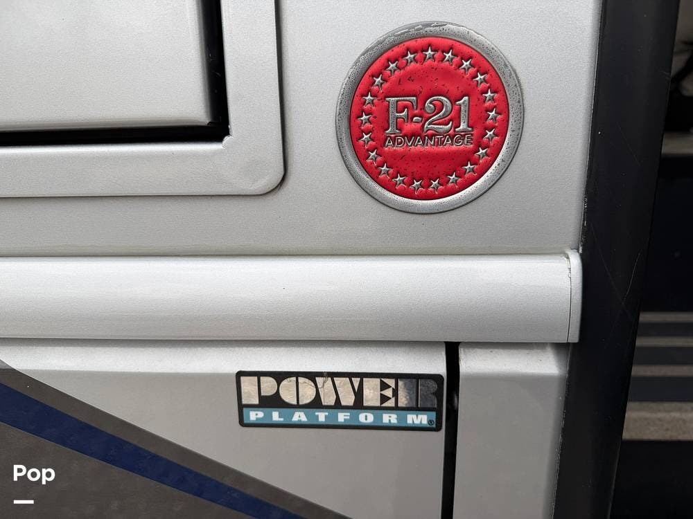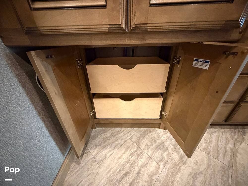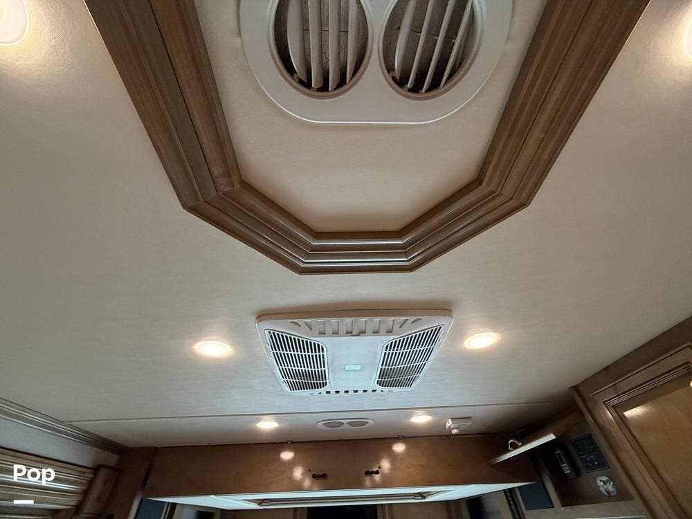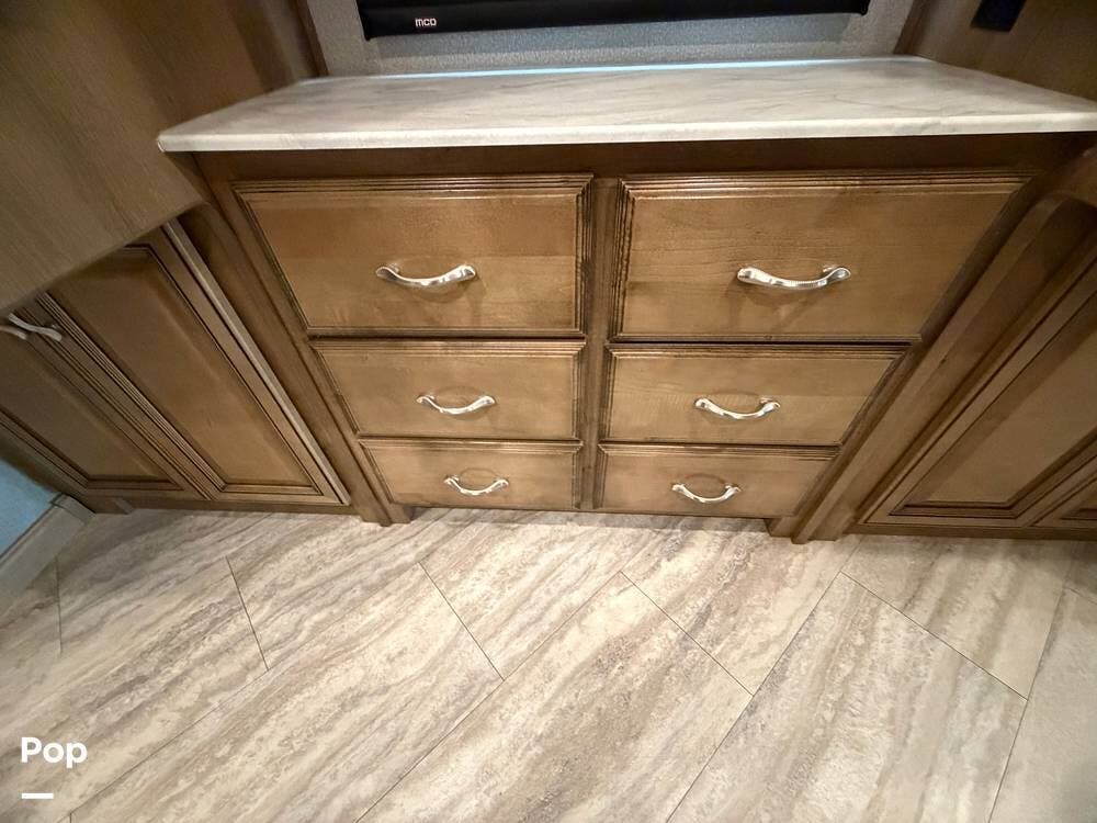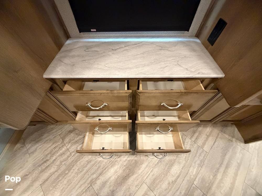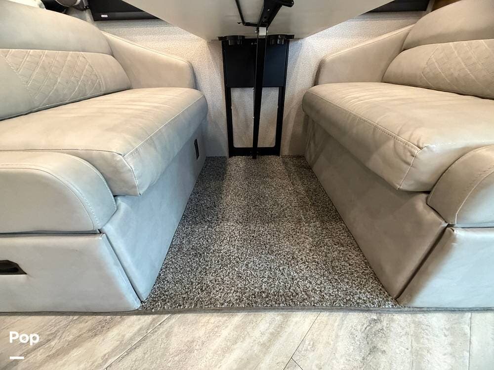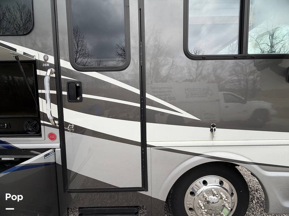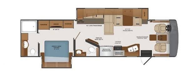 The desirable 35K floorplan features opposing slide-outs that create a wide-open living area, a convenient bath-and-a-half layout, and a power drop-down bed over the cockpit for additional sleeping space.