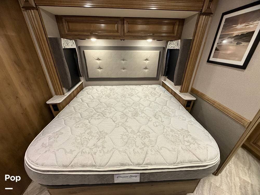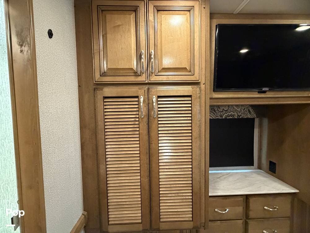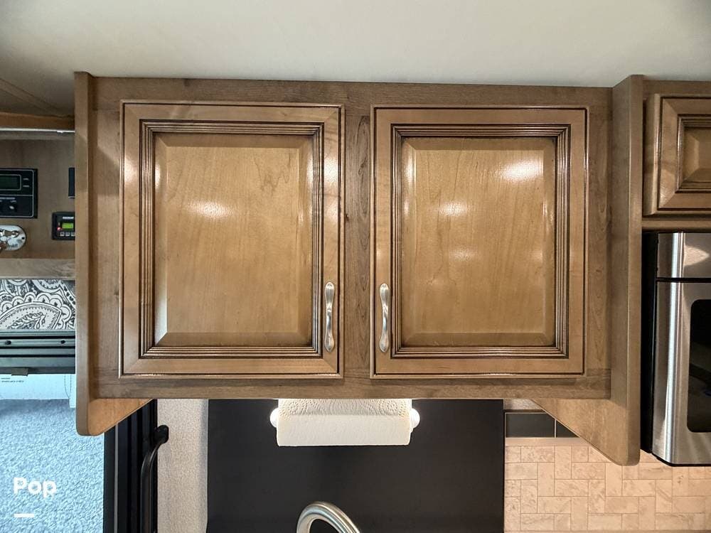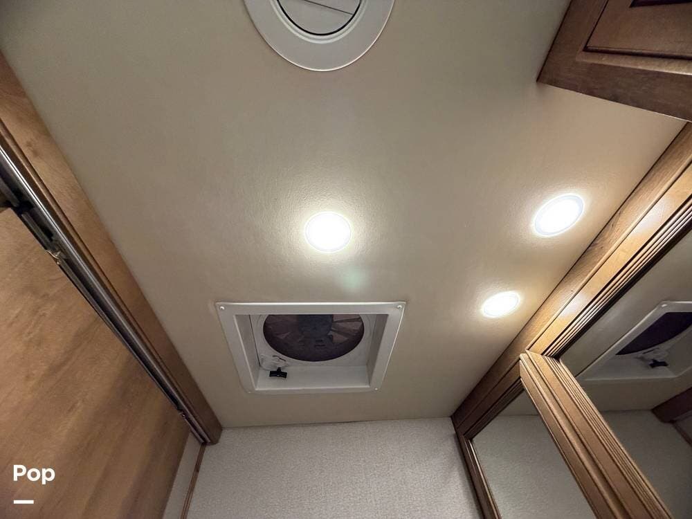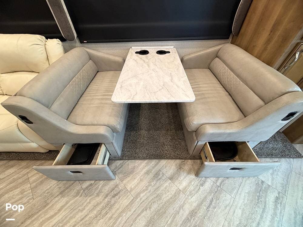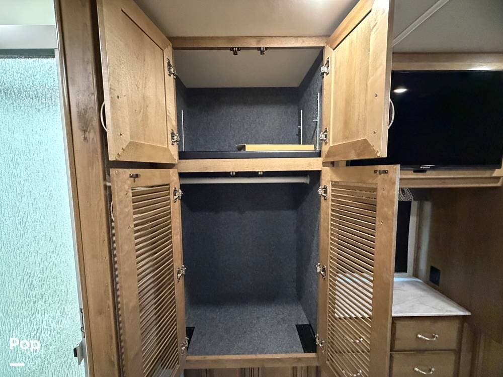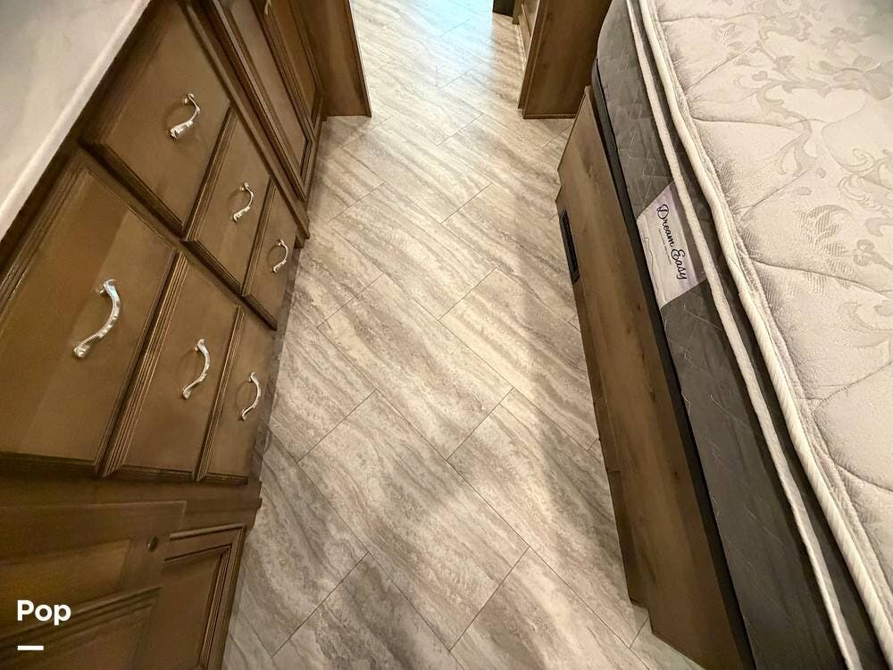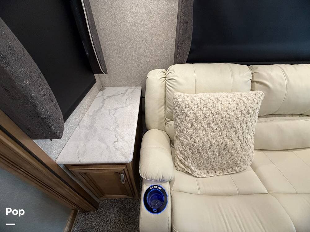 The desirable 35K floorplan features opposing slide-outs that create a wide-open living area, a convenient bath-and-a-half layout, and a power drop-down bed over the cockpit for additional sleeping space.