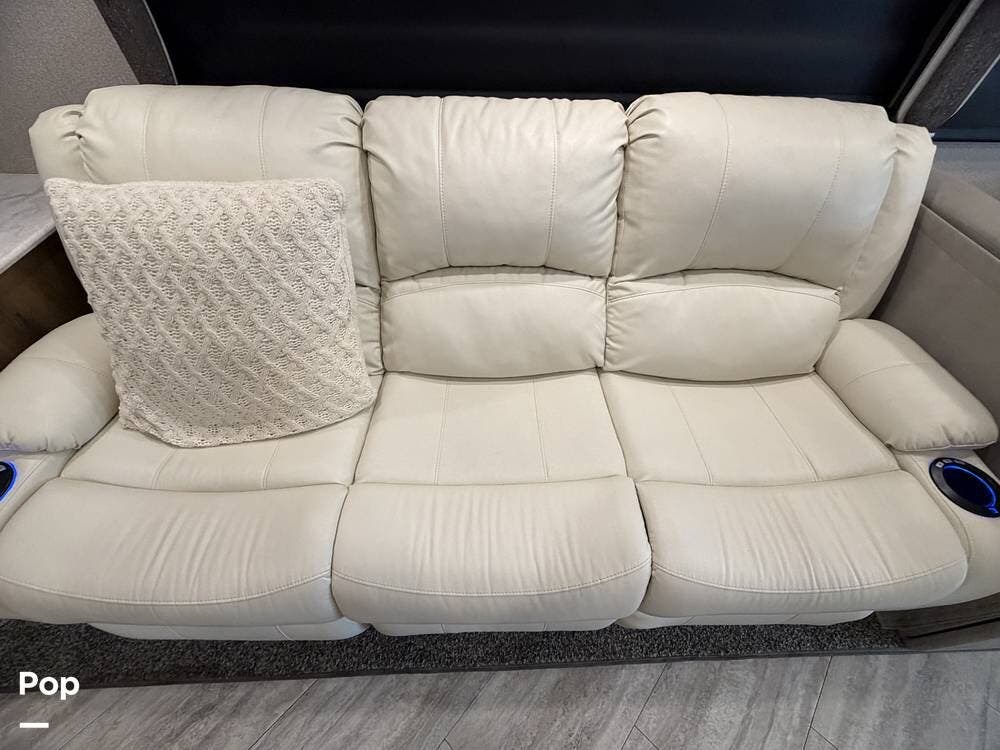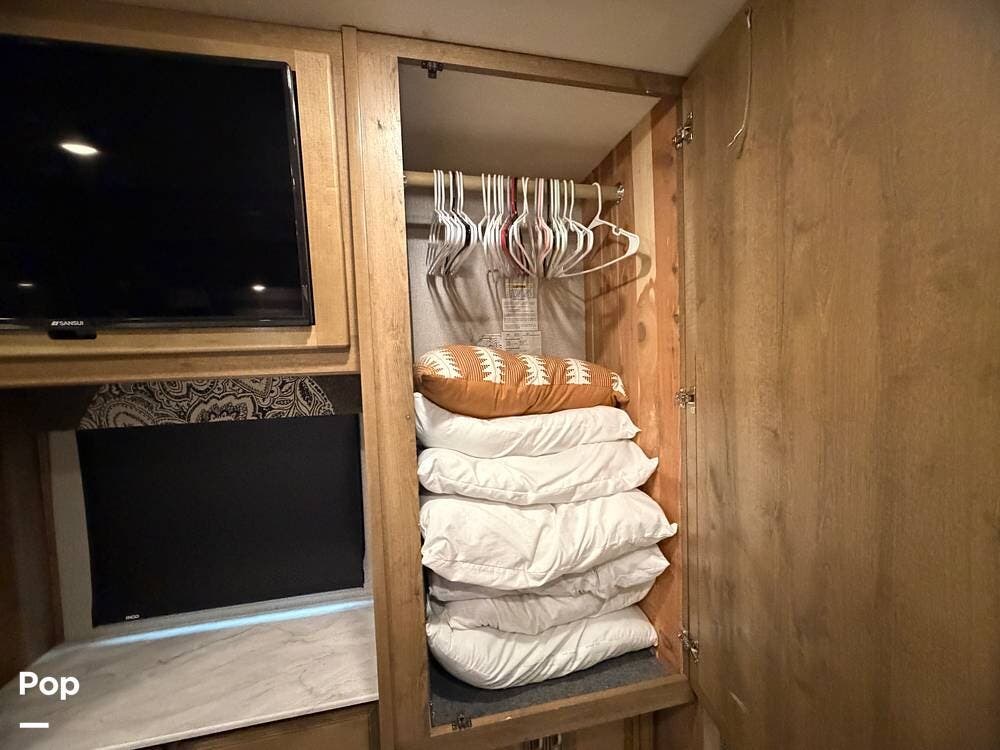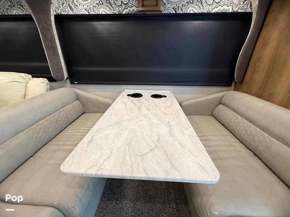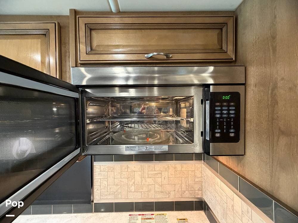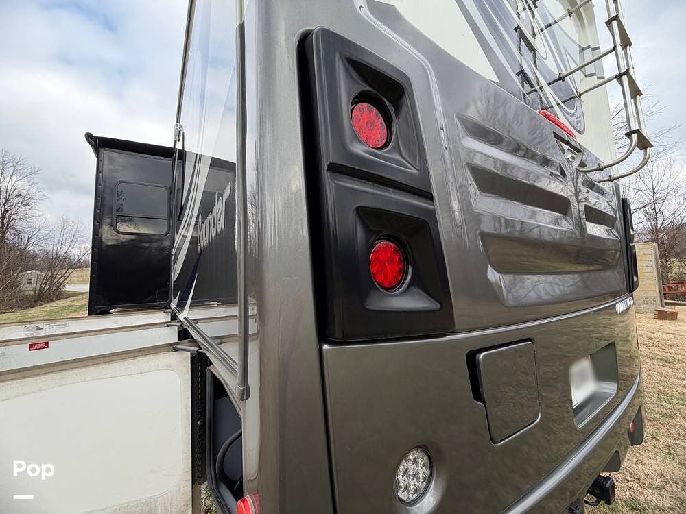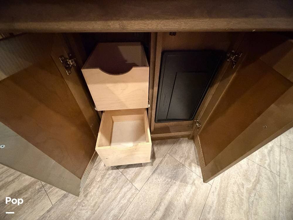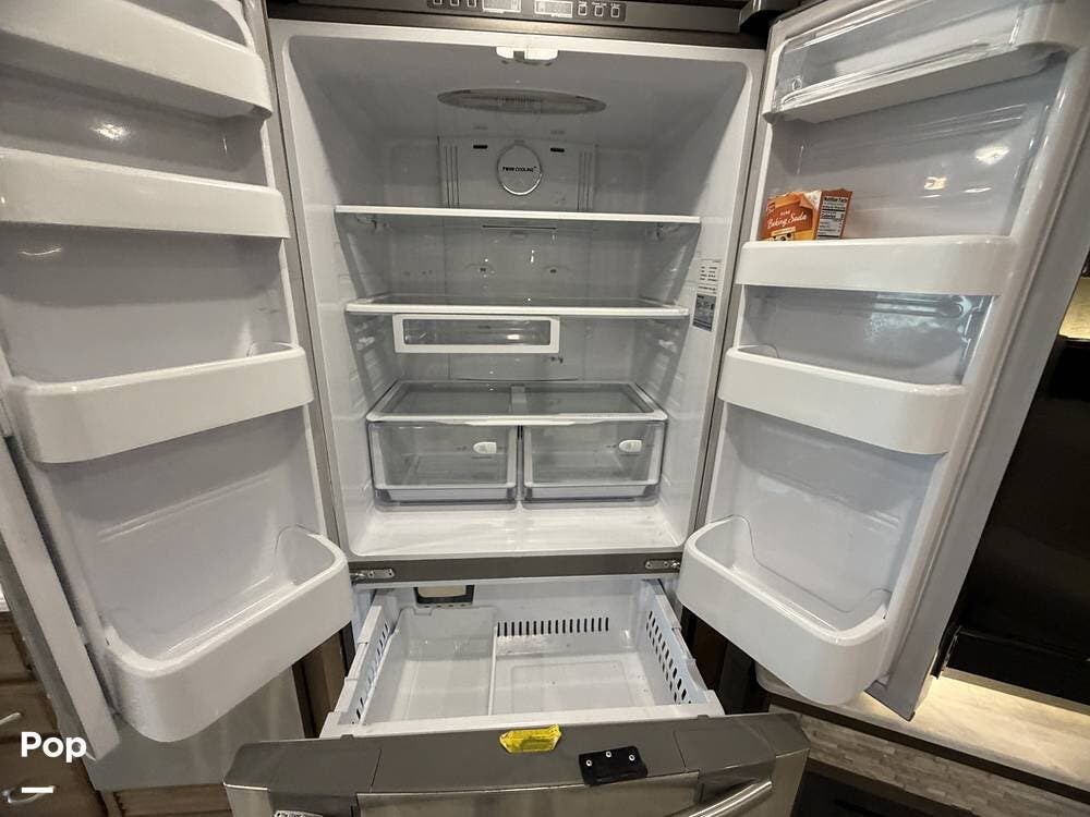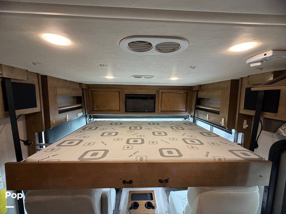 The desirable 35K floorplan features opposing slide-outs that create a wide-open living area, a convenient bath-and-a-half layout, and a power drop-down bed over the cockpit for additional sleeping space.