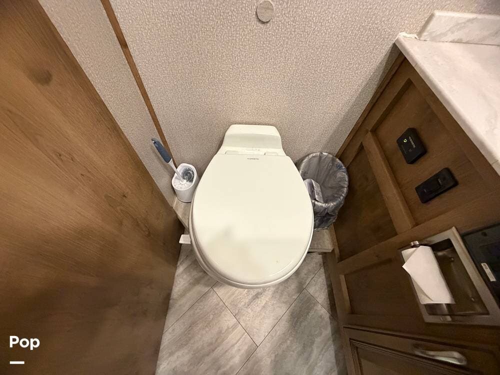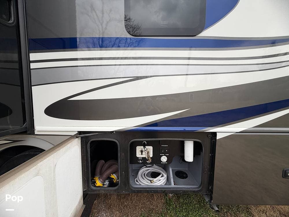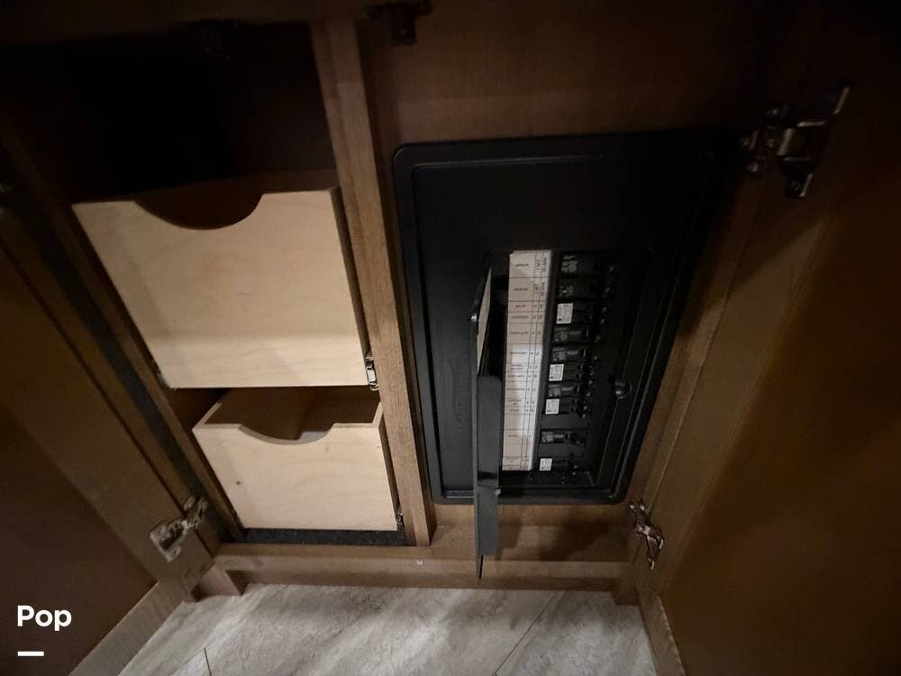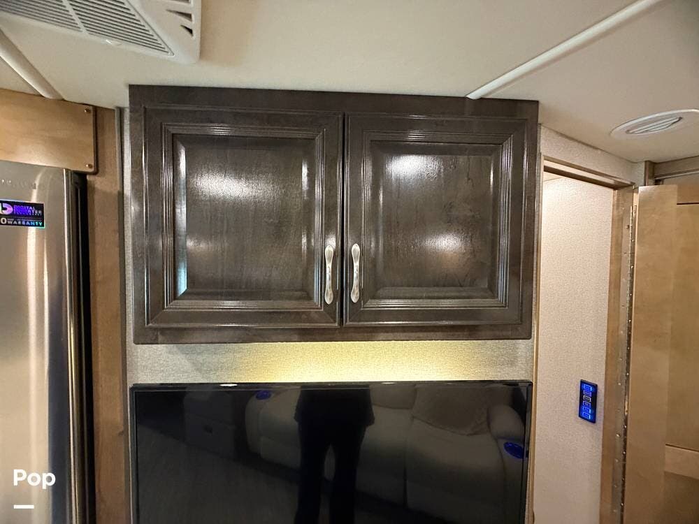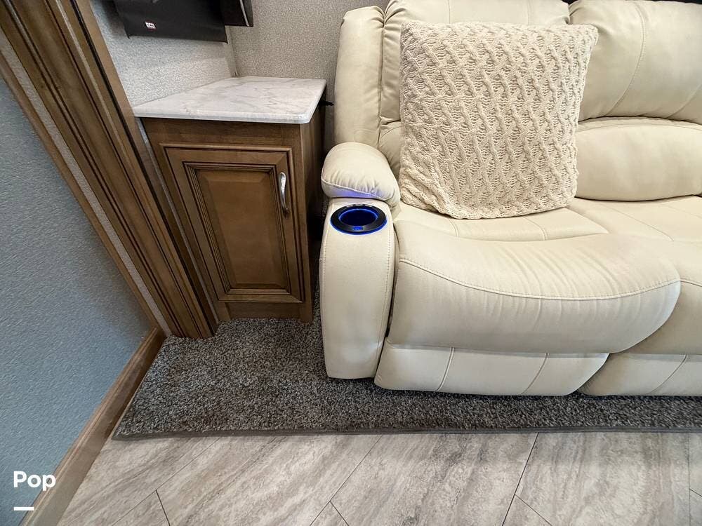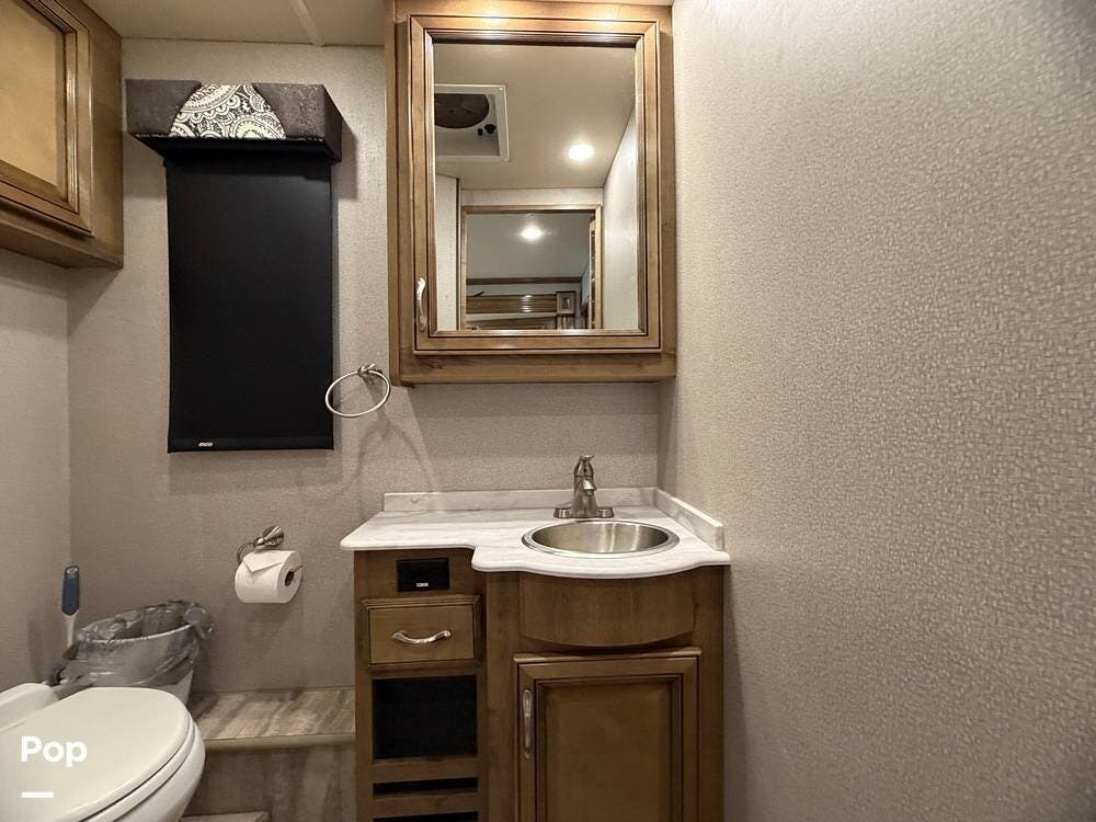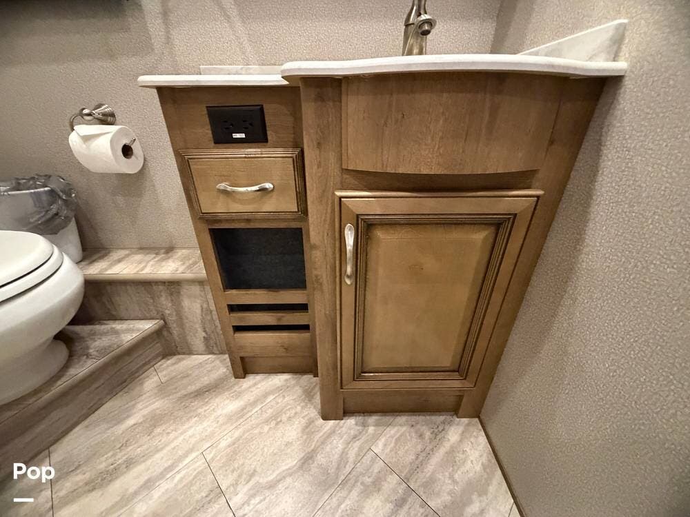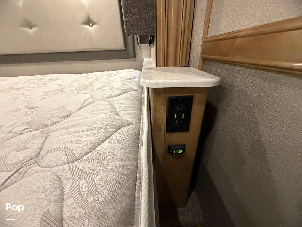 The desirable 35K floorplan features opposing slide-outs that create a wide-open living area, a convenient bath-and-a-half layout, and a power drop-down bed over the cockpit for additional sleeping space.