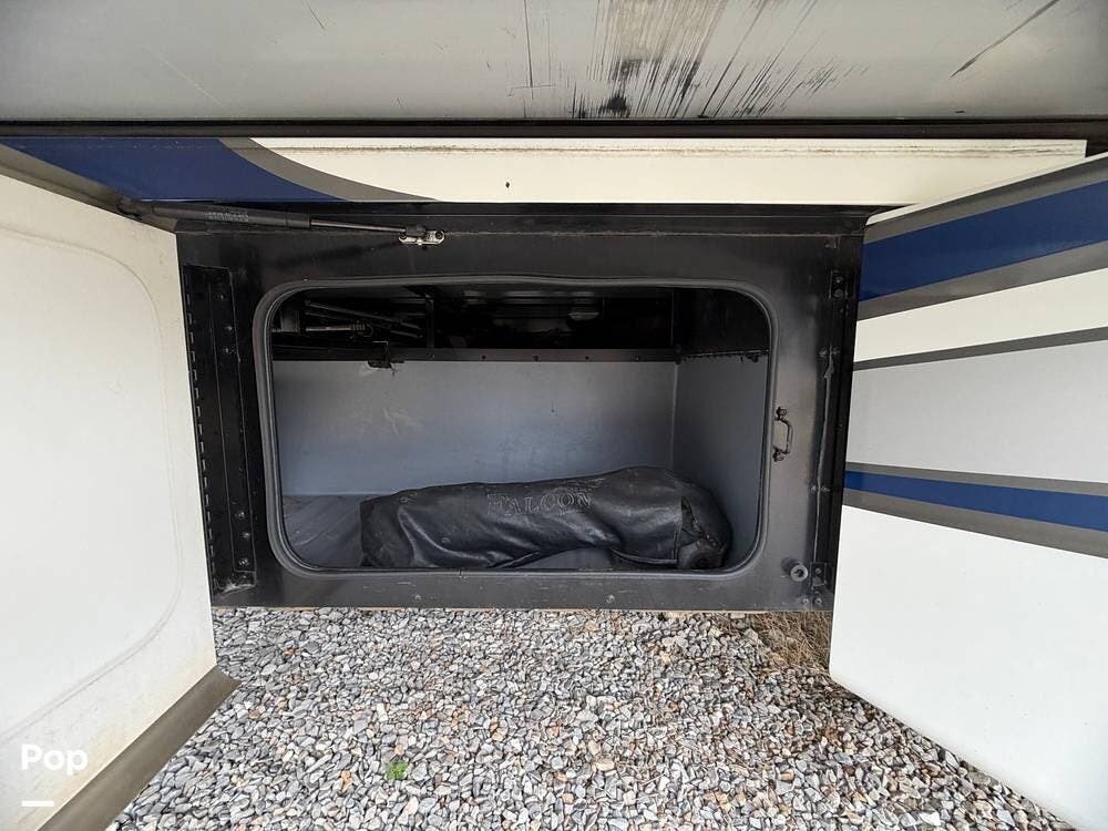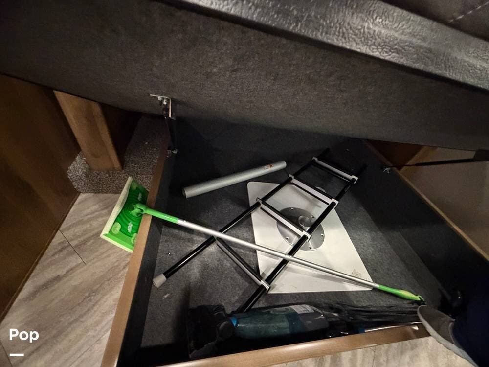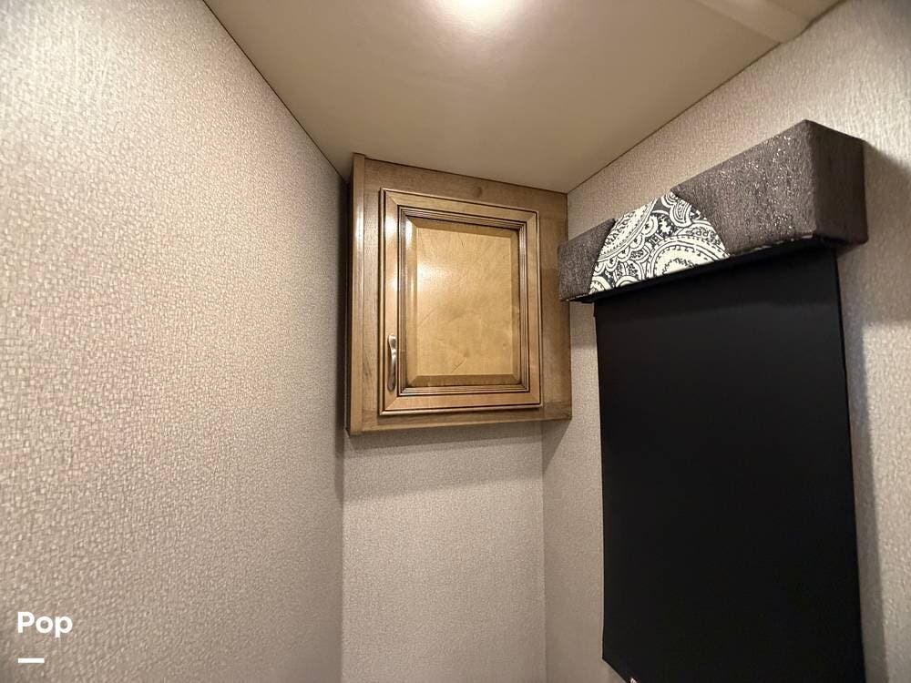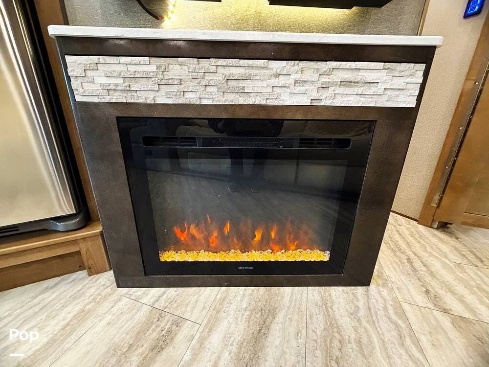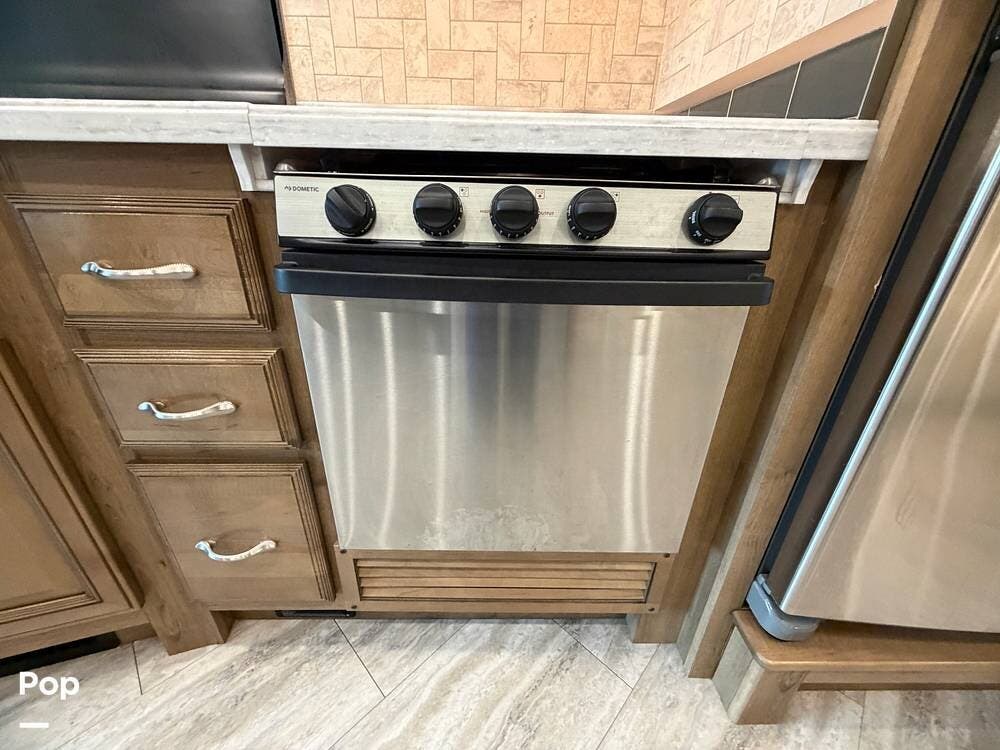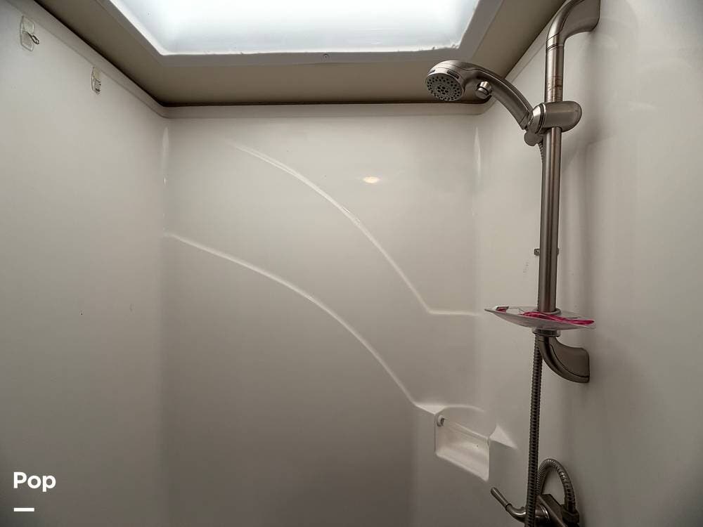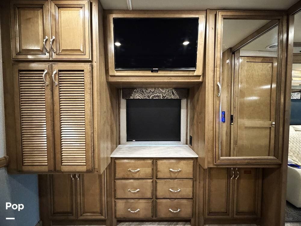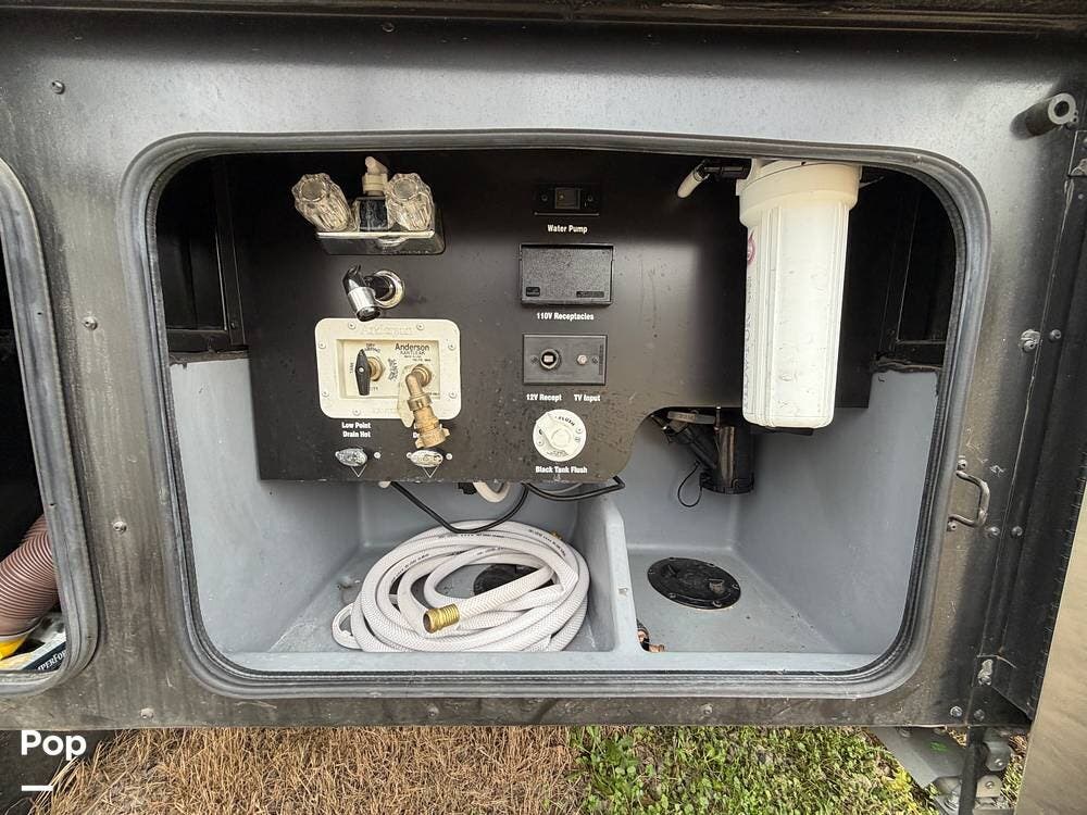 The desirable 35K floorplan features opposing slide-outs that create a wide-open living area, a convenient bath-and-a-half layout, and a power drop-down bed over the cockpit for additional sleeping space.