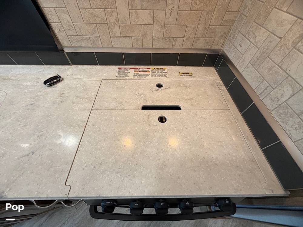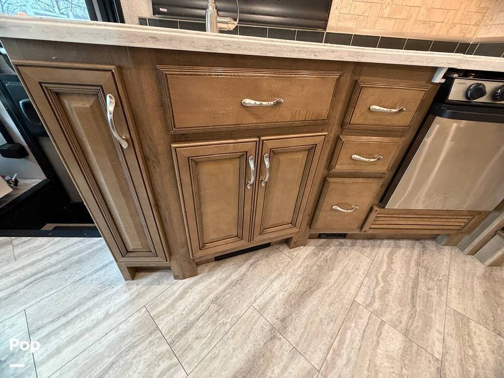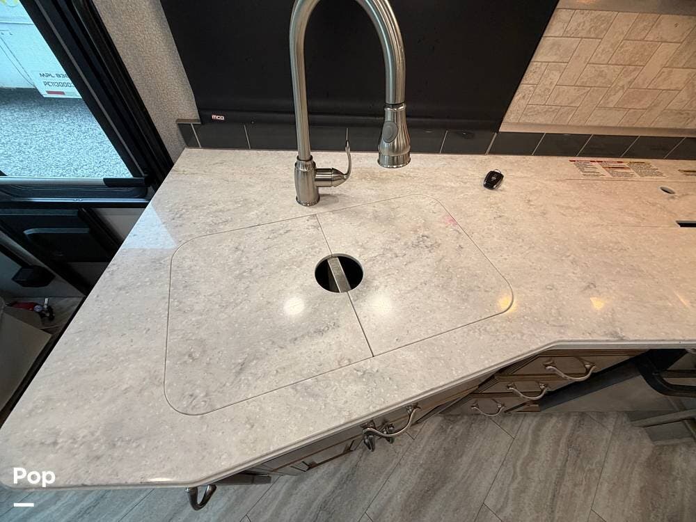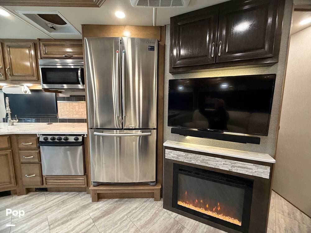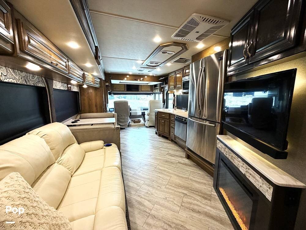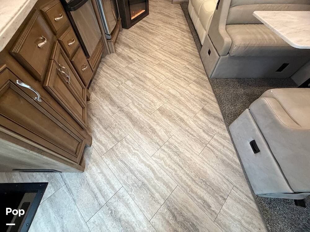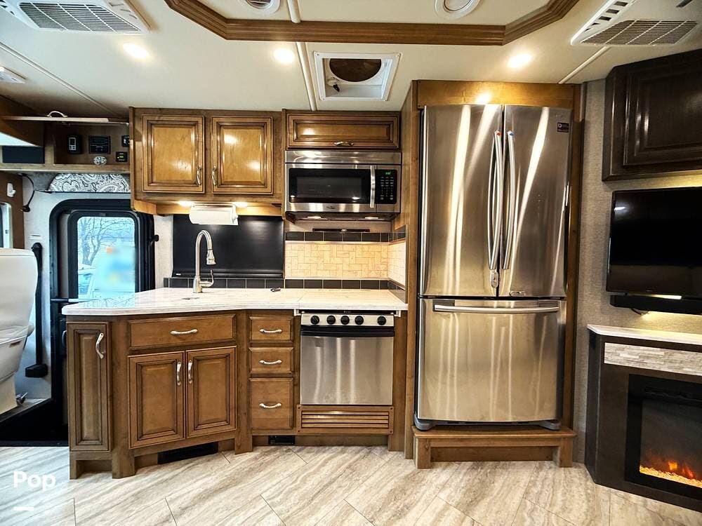 Inside, the coach offers a residential-style kitchen with solid-surface countertops, ample cabinetry, a large refrigerator, and a comfortable dinette, along with a welcoming living area for relaxing or entertaining.