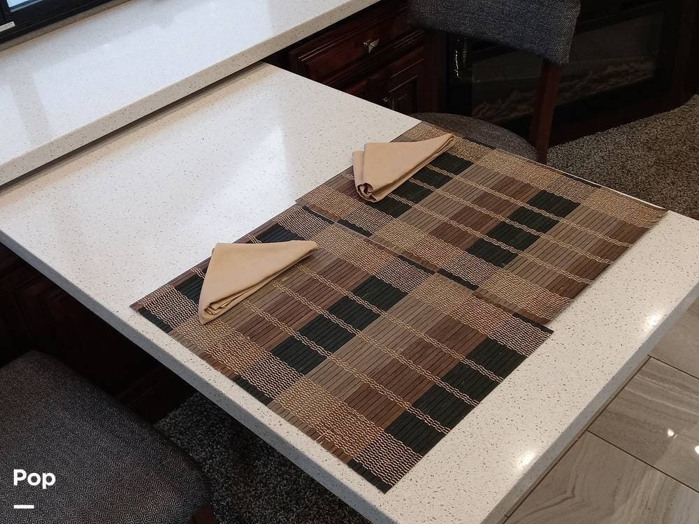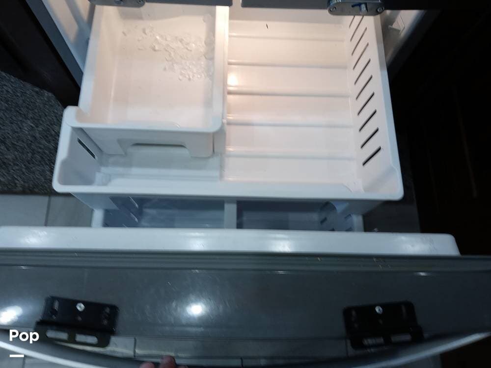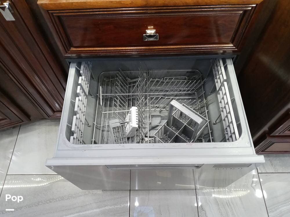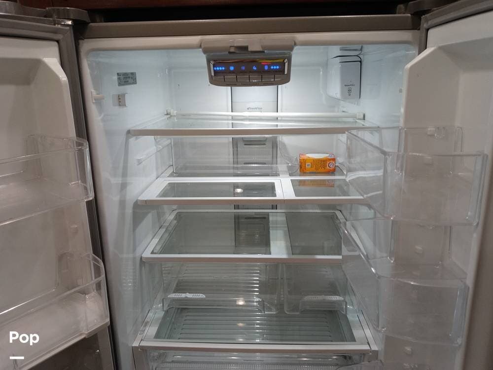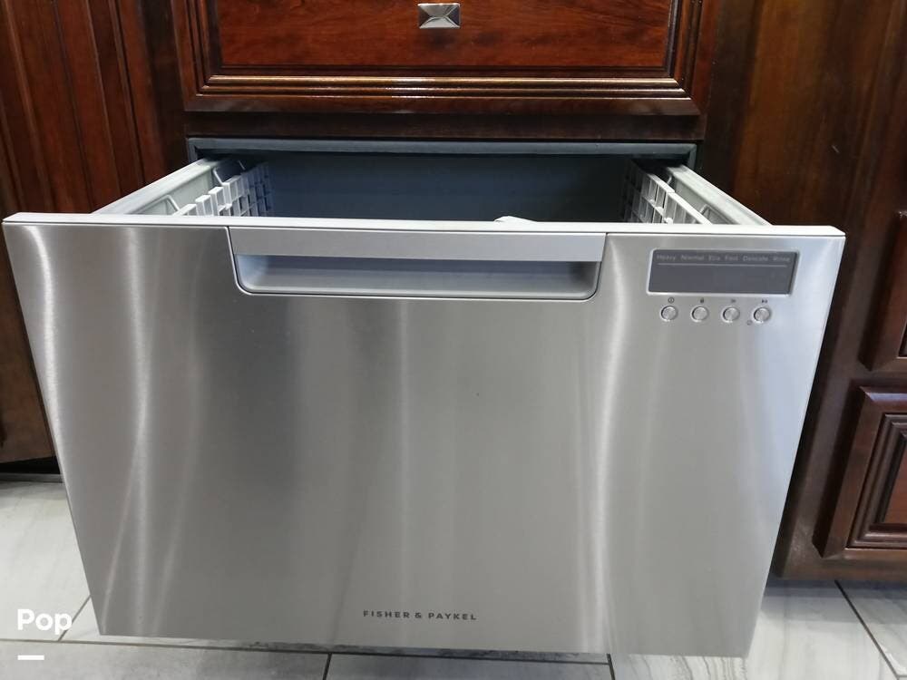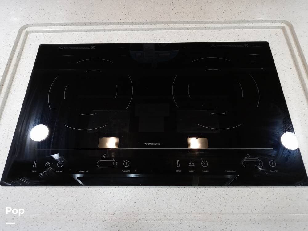 A wide-open floor plan includes a large kitchen with a high-output Induction electric two-burner cooktop, a large double-door stainless steel refrigerator freezer, and a drawer dishwasher. A great feature for versatility is the polished solid-surface countertops with sink and cooktop covers. Also included in the kitchen is a 1000-watt microwave-convection oven.