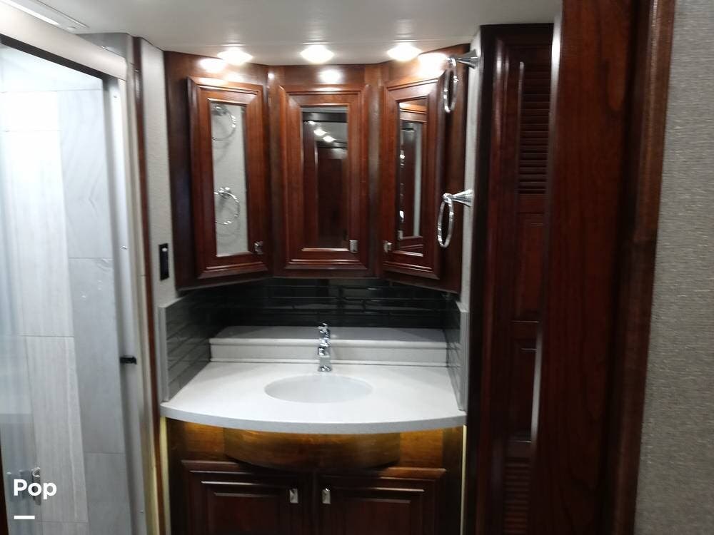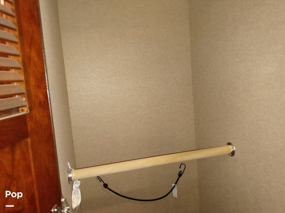 The master bedroom has a king-size bed with plenty of drawers and wardrobe storage space. A large master bathroom includes a large shower with bench seating. There is another half-bath in the middle of the RV between the living area and the master bedroom.