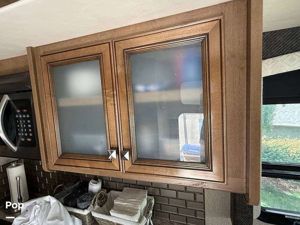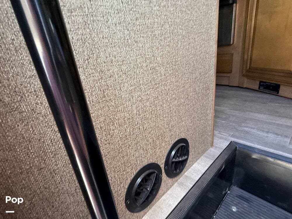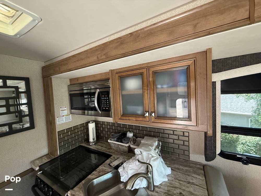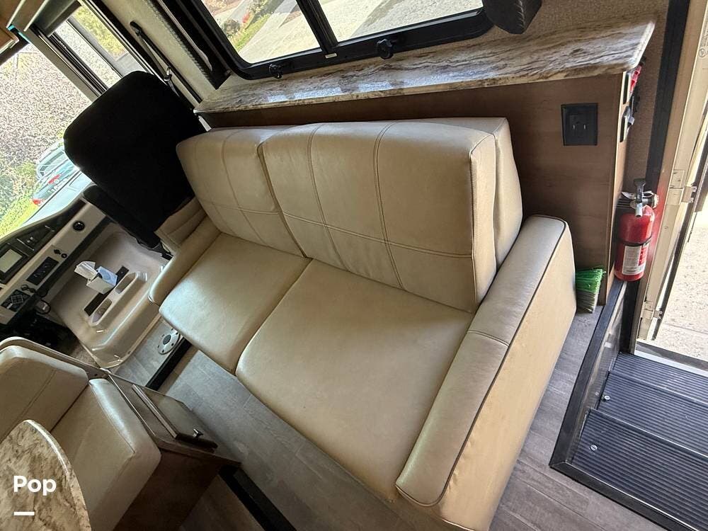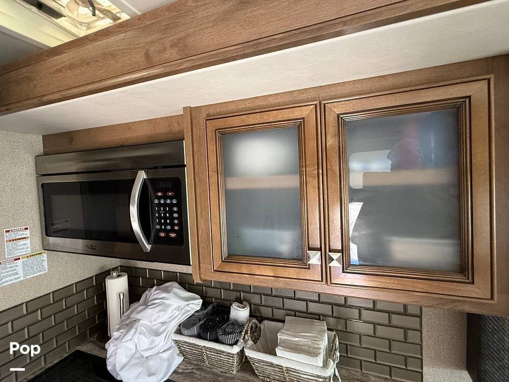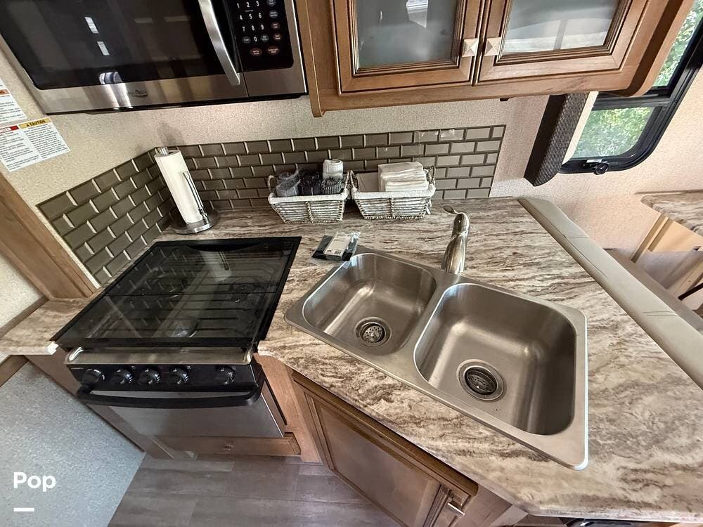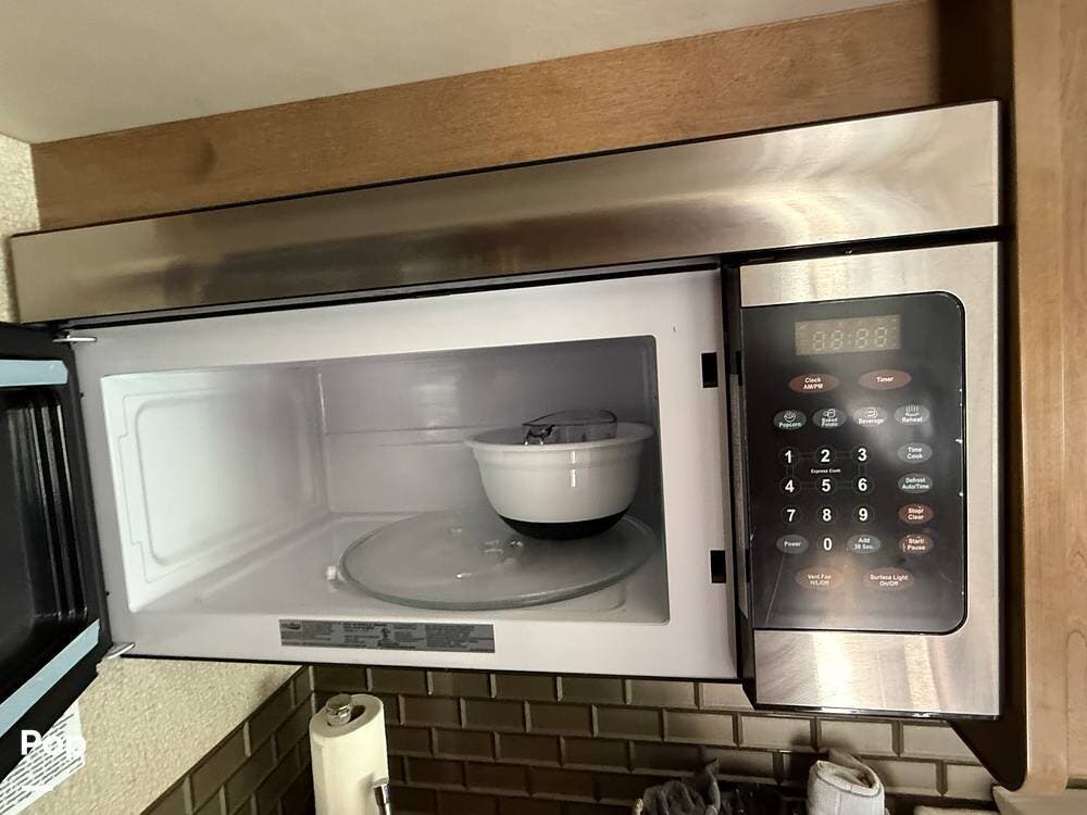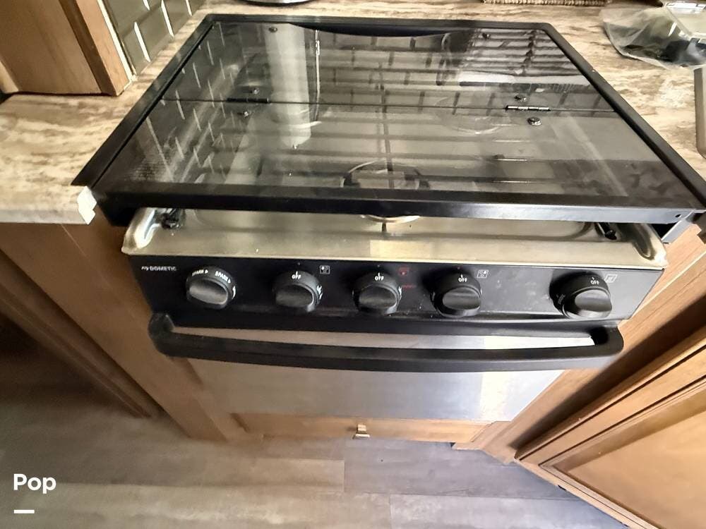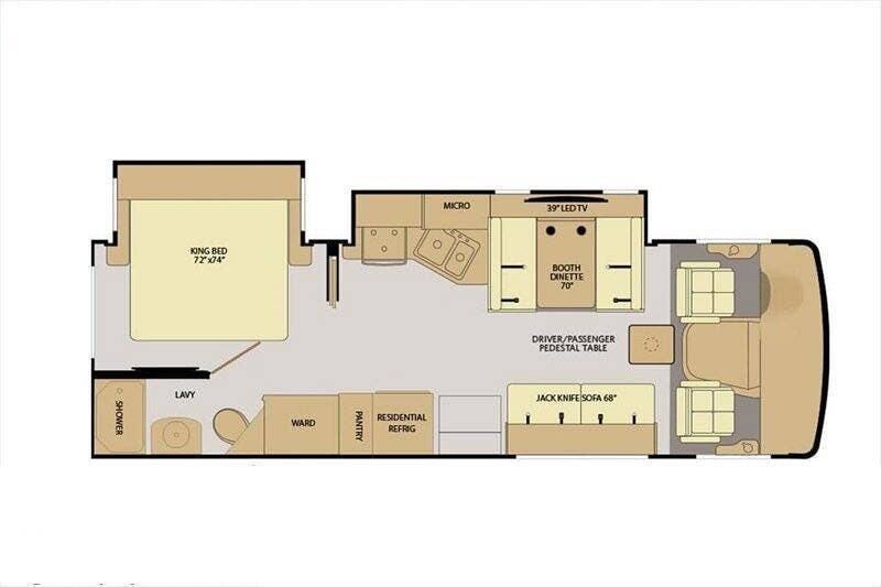 The kitchen features solid-surface countertops, a three-burner cooktop, microwave, and residential-style refrigerator, ready for home-cooked meals on the go. Relax after a day of exploring with the large flat-screen TV, built-in entertainment center, and efficient climate control system.