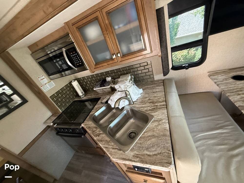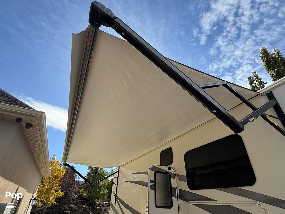 Step inside and you'll find a bright, spacious interior with modern finishes, comfortable furnishings, and all the amenities that make travel effortless. The dual slide-outs open up the living space, while the queen bed, convertible dinette, and powered drop-down bunk ensure everyone has a cozy place to rest.