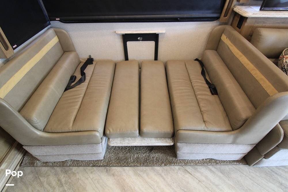 The convertible sofa and stadium recliners highlight the front living plan and the large flat screen TV is on a televator by the convertible dinette.