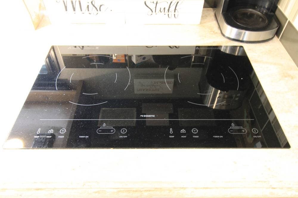 The kitchen in mid-coach and in addition to a flattop stove and large double well sink, the convection microwave and full size refrigerator with a built-in icemaker will make any camp chef feel at home.