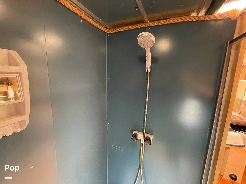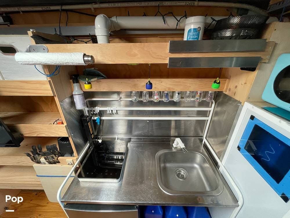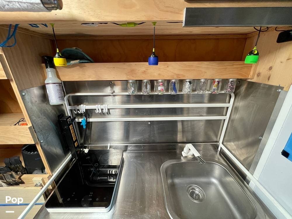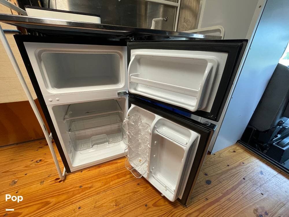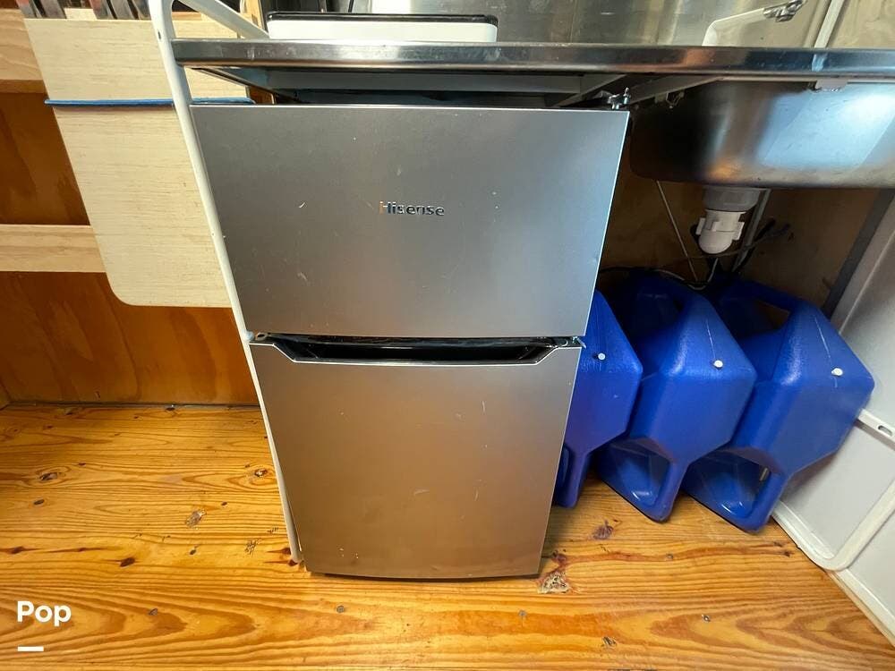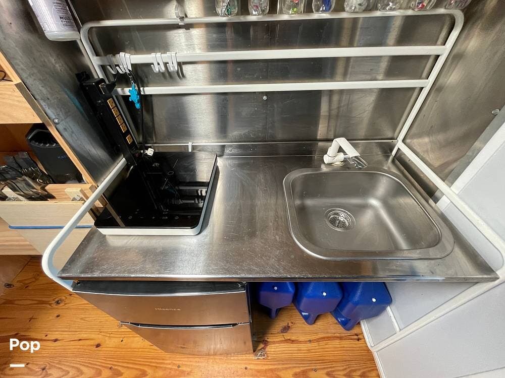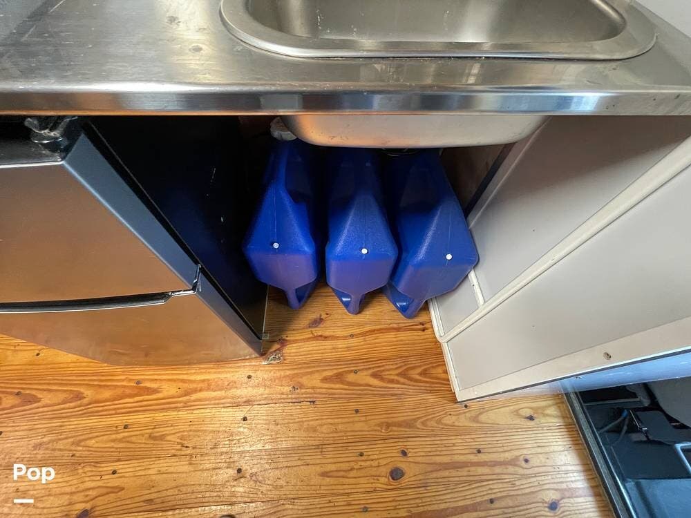 Across from the shower is the galley area. It contains a microwave, sink, stove top, and a refrigerator/freezer. There are separate portable water jugs that the systems pull.