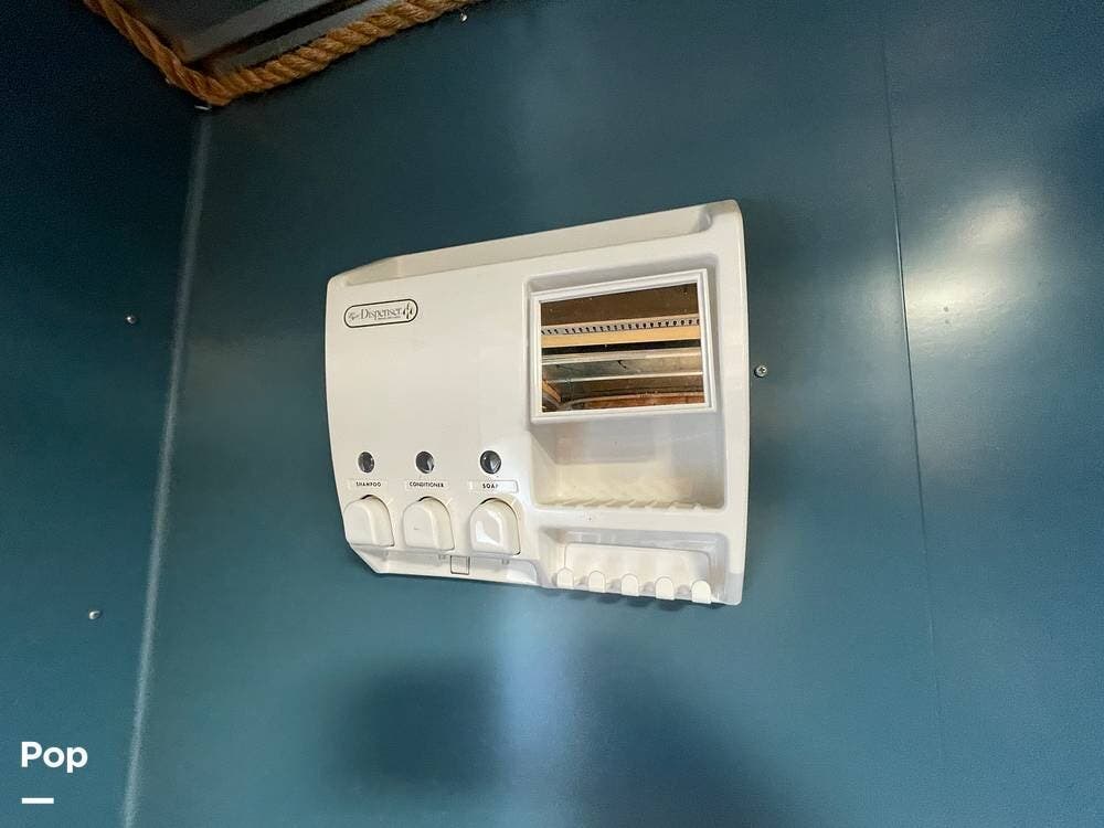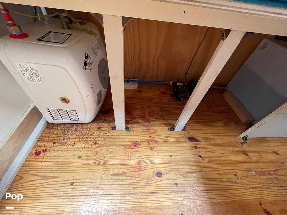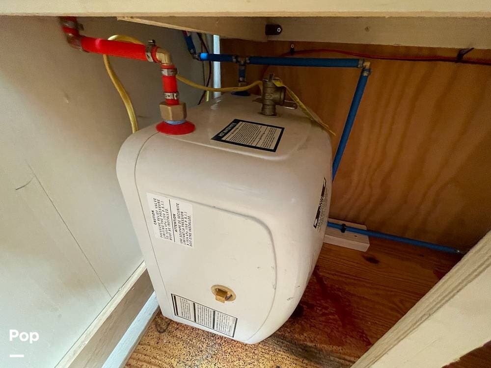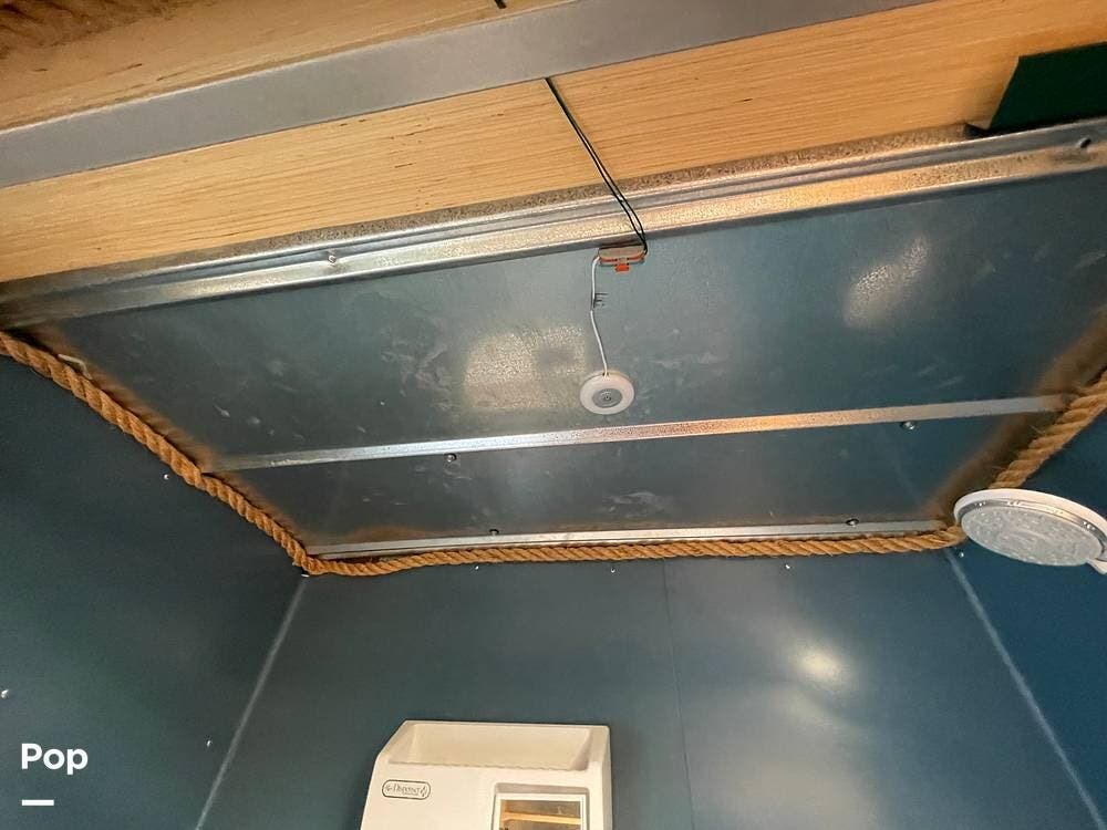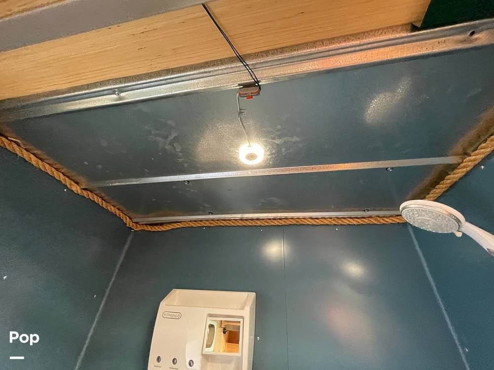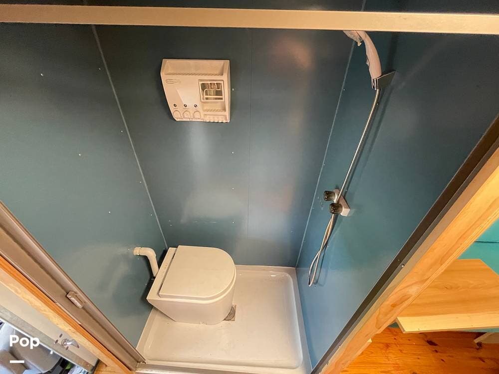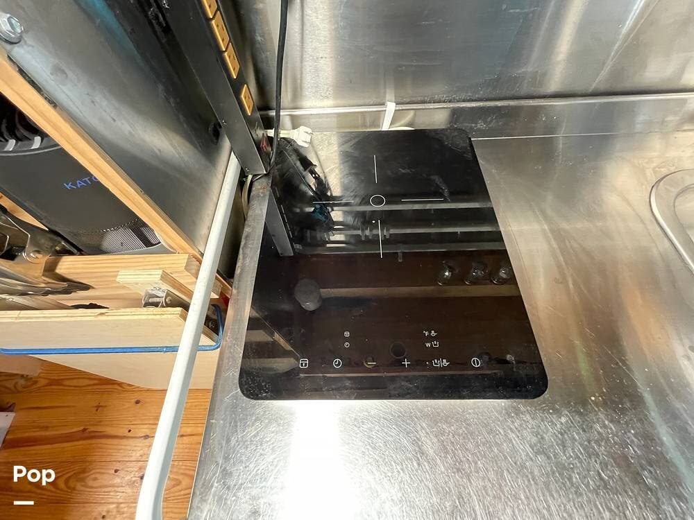 Across from the shower is the galley area. It contains a microwave, sink, stove top, and a refrigerator/freezer. There are separate portable water jugs that the systems pull.