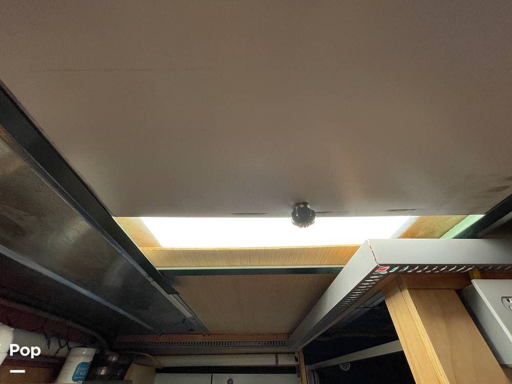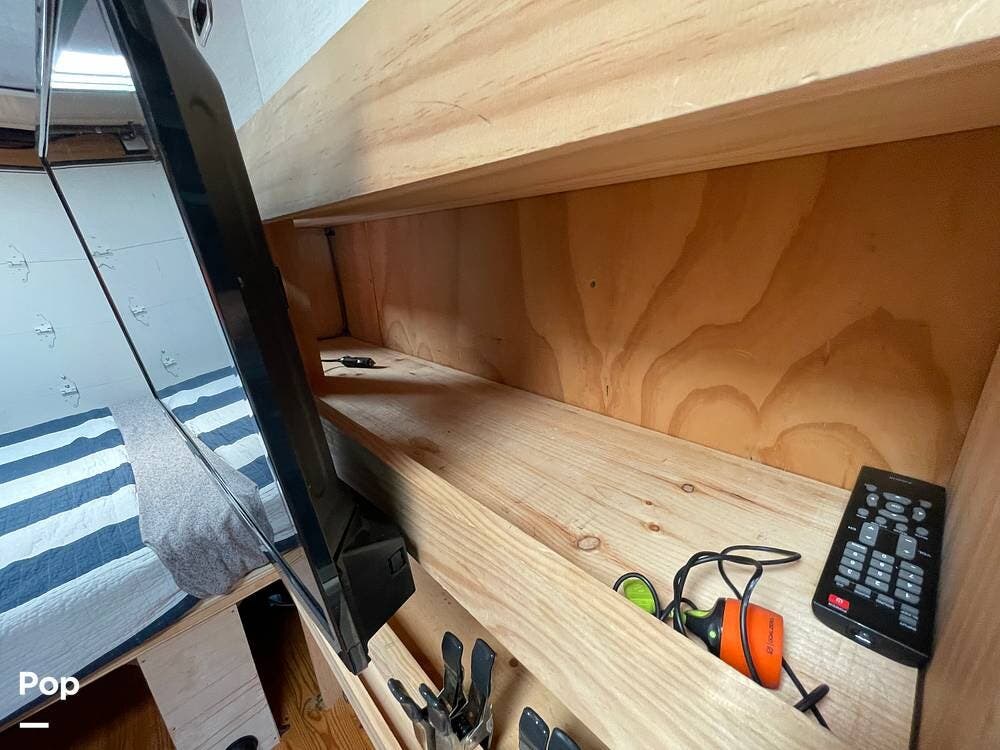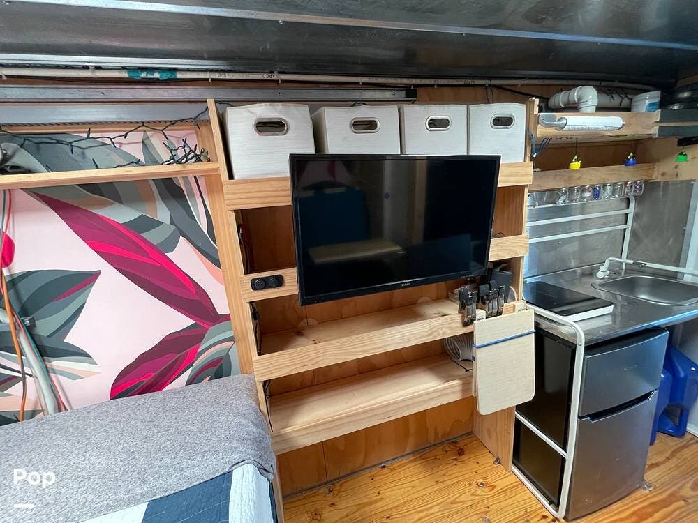 Positioned along the driver's side are storage shelves, some of which feature storage baskets, as well as a TV for viewing.