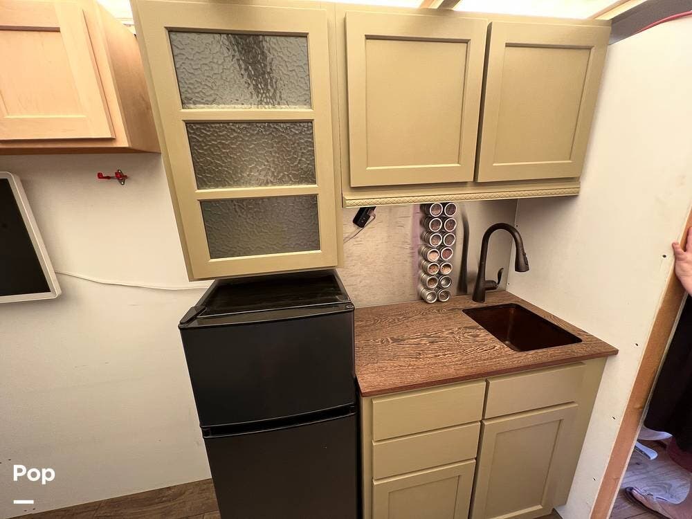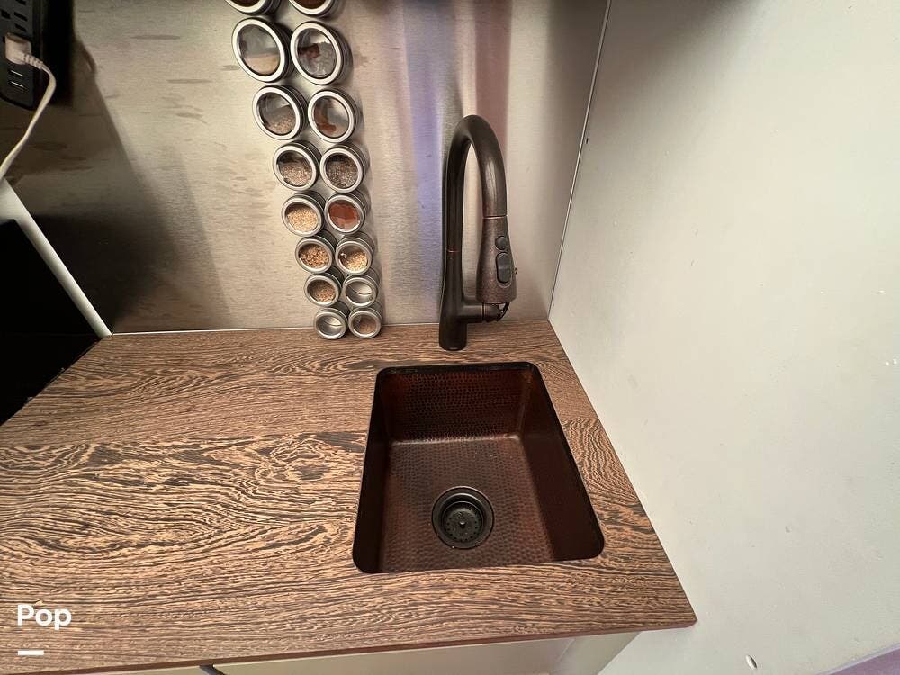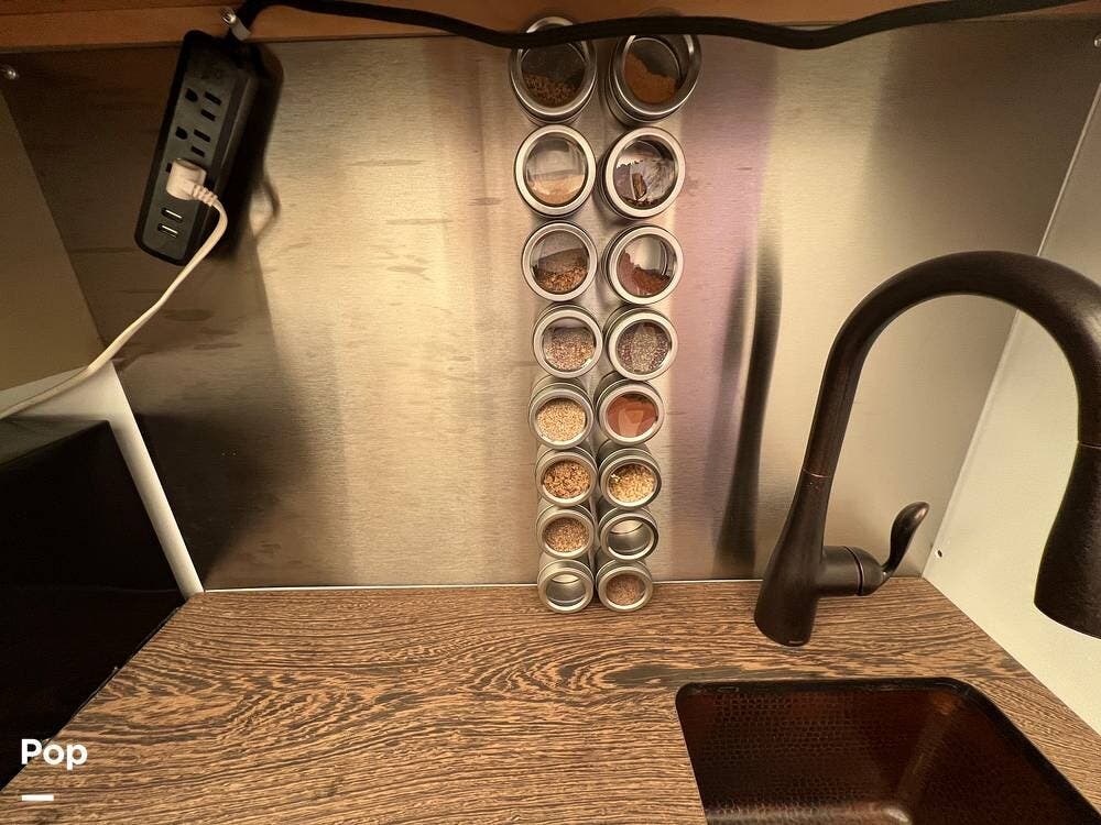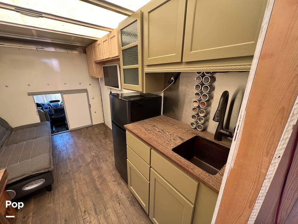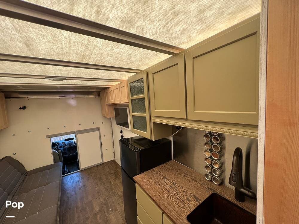 The Ford Transit has been converted to a small RV with ample room. The kitchen has a magnetic backsplash and easy-to-store spices, knives, etc. Plumbing for the sink is present (pictured), just not installed.