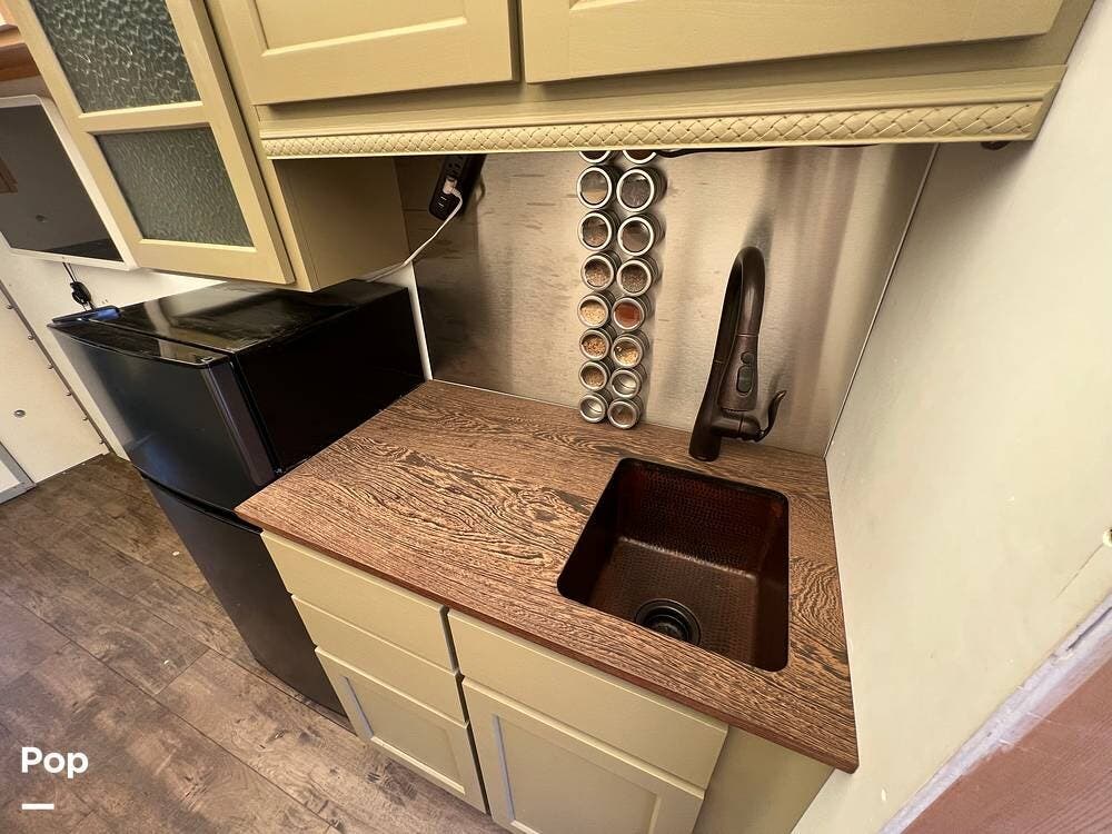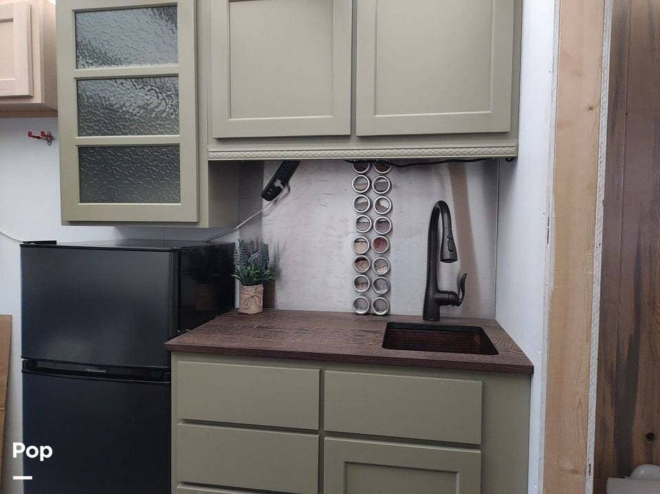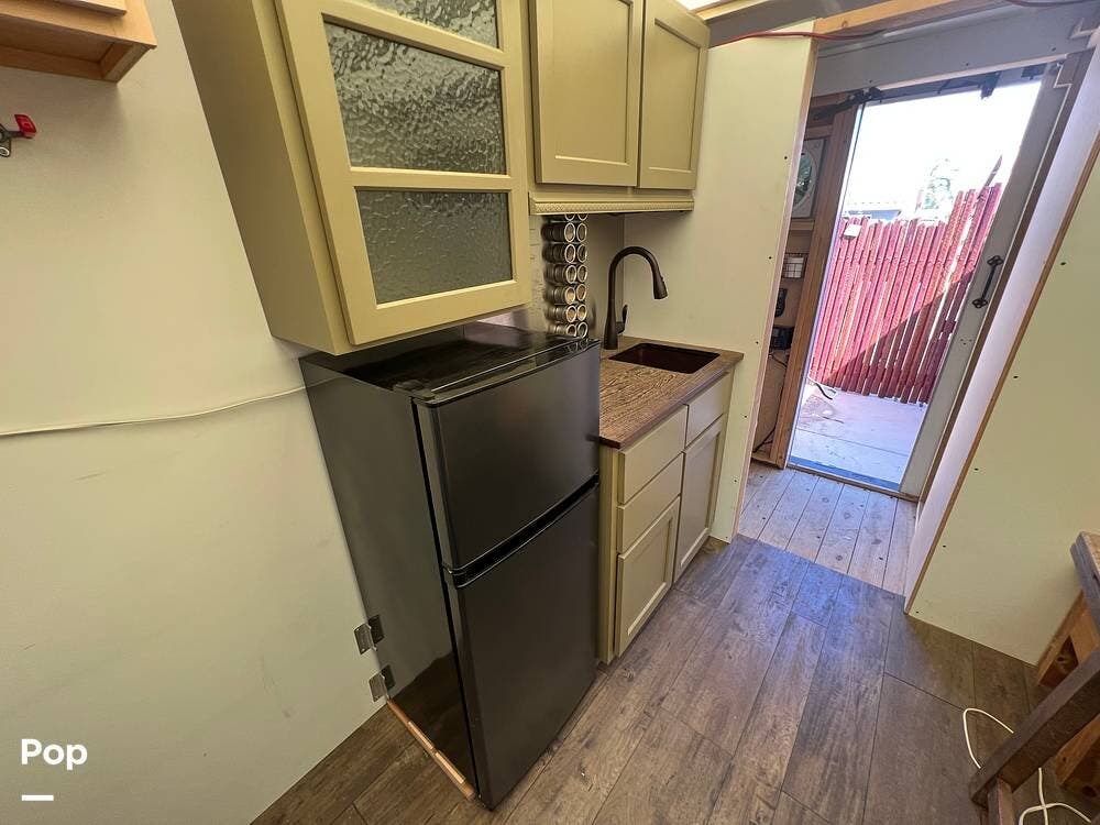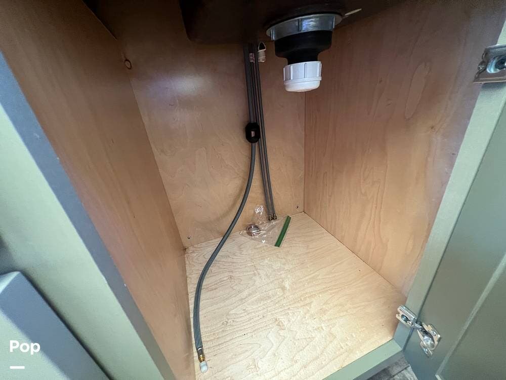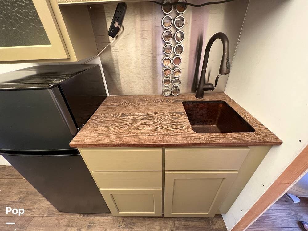The Ford Transit has been converted to a small RV with ample room. The kitchen has a magnetic backsplash and easy-to-store spices, knives, etc. Plumbing for the sink is present (pictured), just not installed.