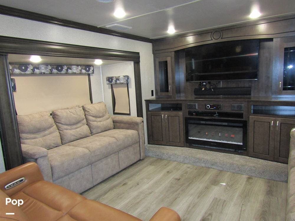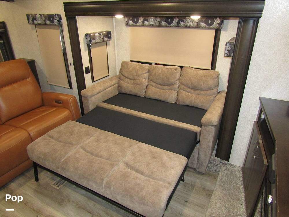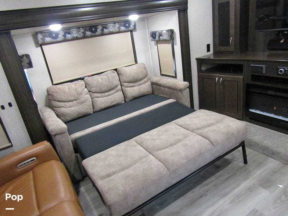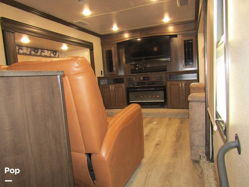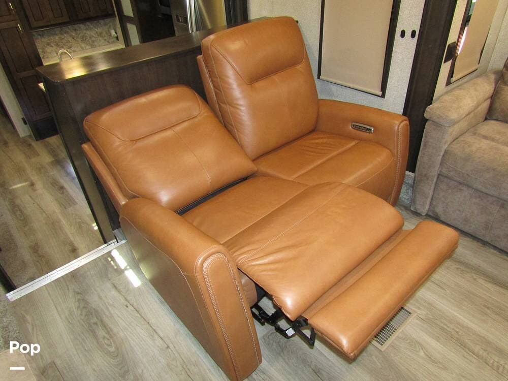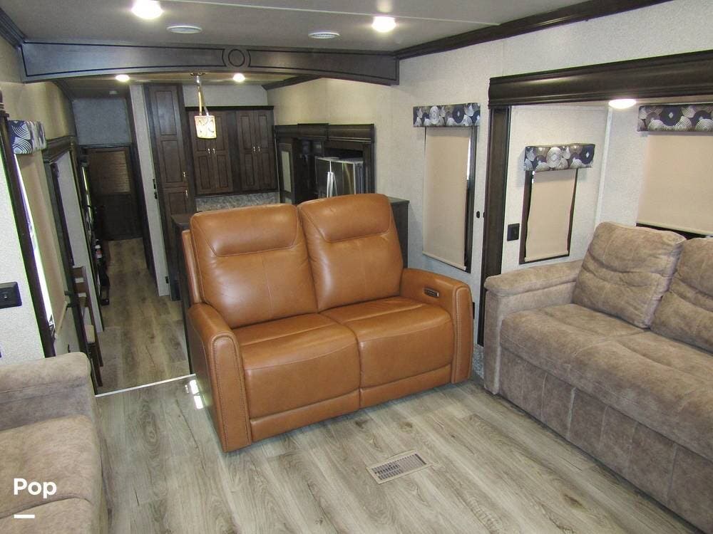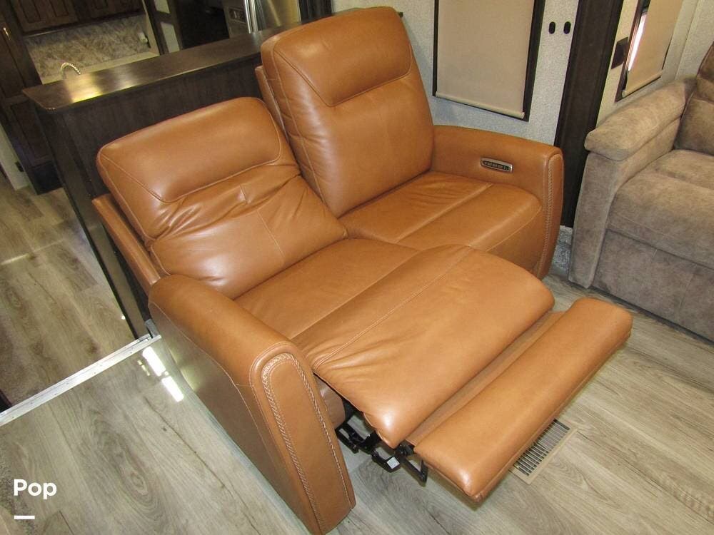 This 5th Wheel features automatic hydraulic leveling, a fireplace, LED interior and exterior lighting, modern, stylish overhead lighting, theater seating recliners with power recline, power lumbar support, and power headrest. two sleeper sofas, a fireplace, an entertainment center, and interior sunscreens.