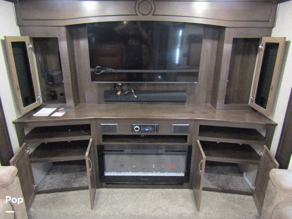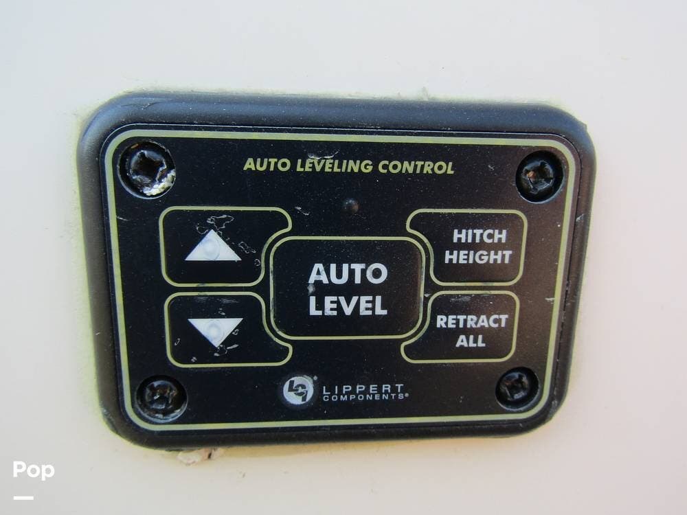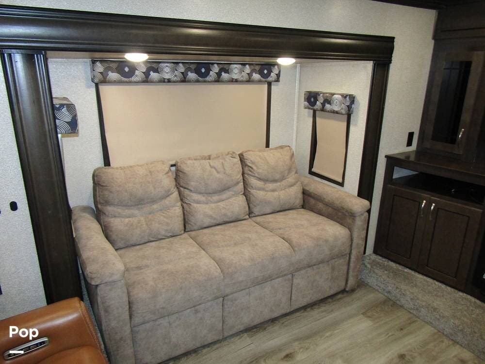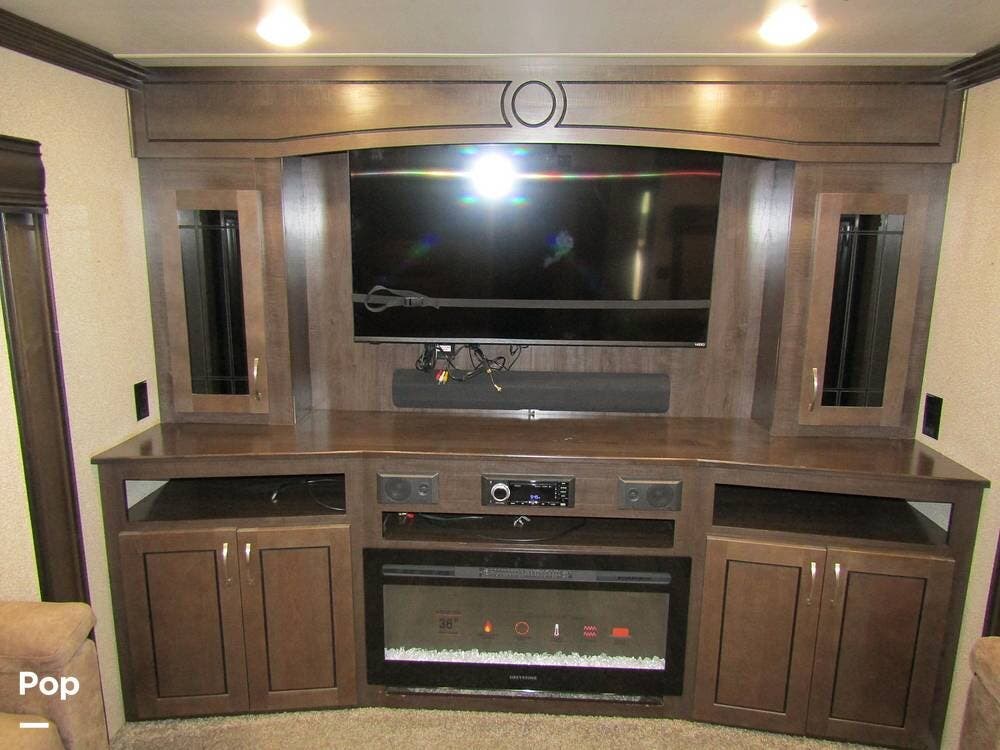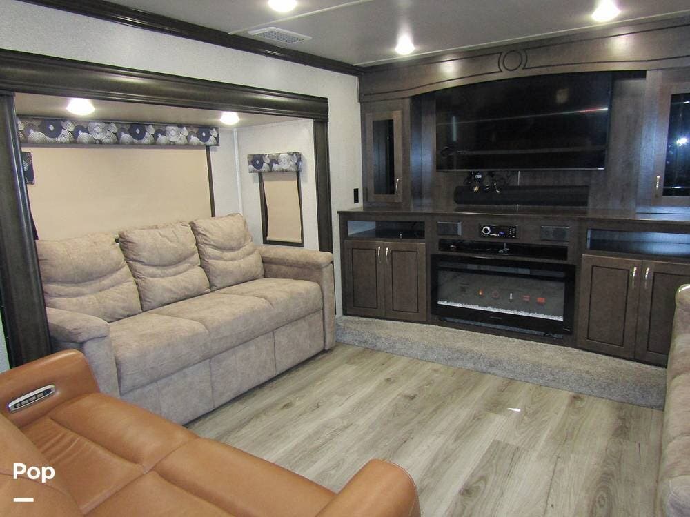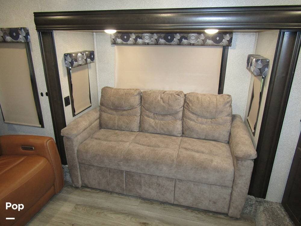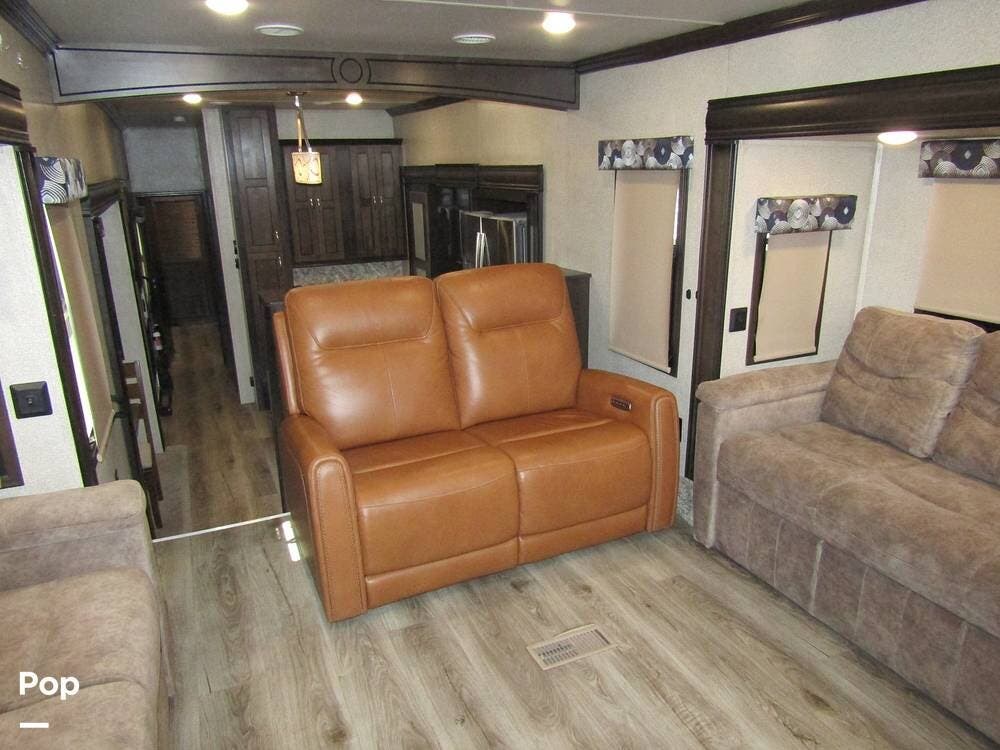 This 5th Wheel features automatic hydraulic leveling, a fireplace, LED interior and exterior lighting, modern, stylish overhead lighting, theater seating recliners with power recline, power lumbar support, and power headrest. two sleeper sofas, a fireplace, an entertainment center, and interior sunscreens.