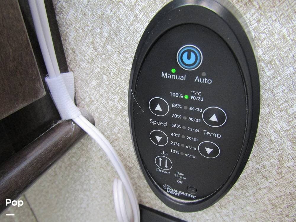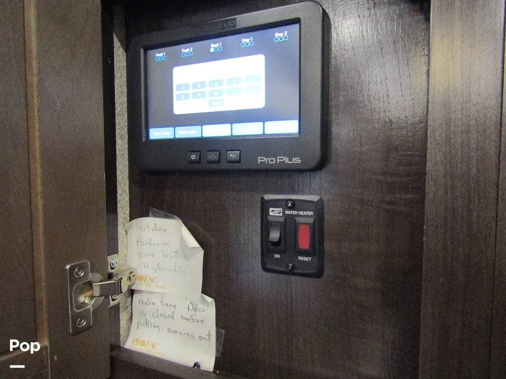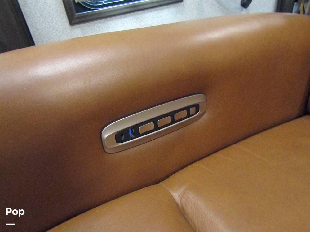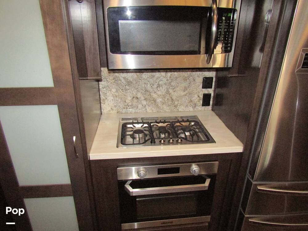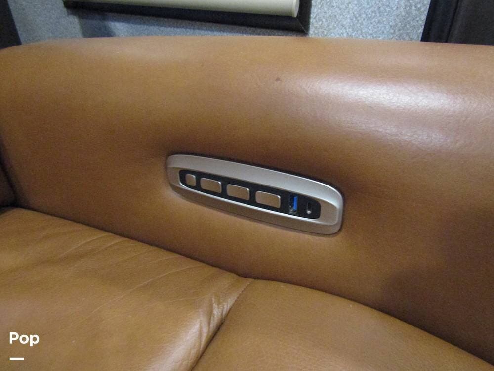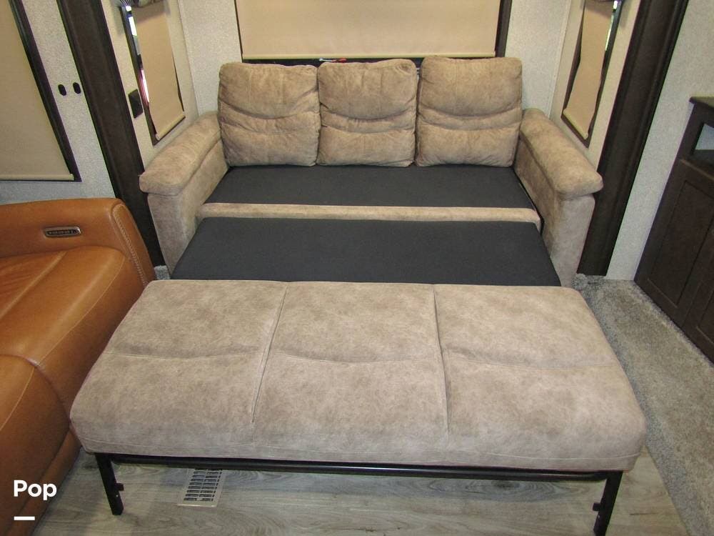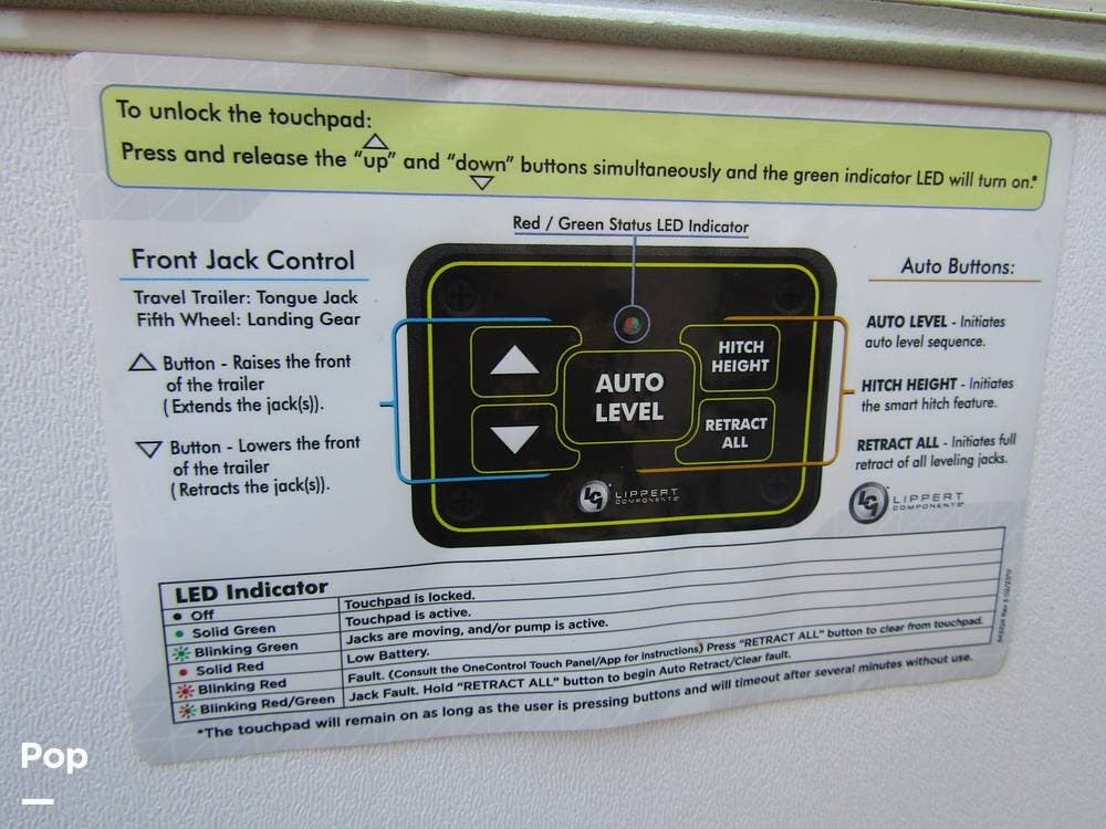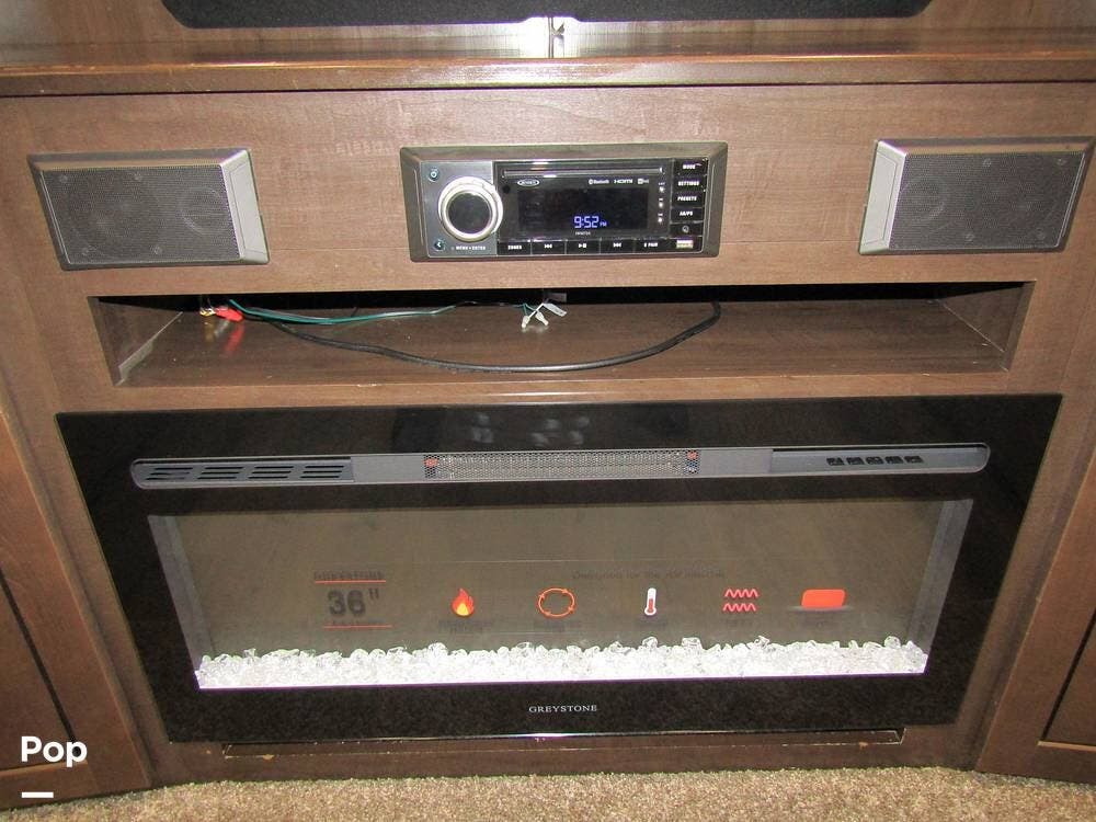 This 5th Wheel features automatic hydraulic leveling, a fireplace, LED interior and exterior lighting, modern, stylish overhead lighting, theater seating recliners with power recline, power lumbar support, and power headrest. two sleeper sofas, a fireplace, an entertainment center, and interior sunscreens.
