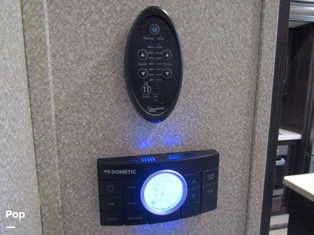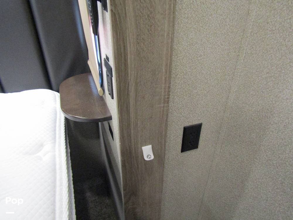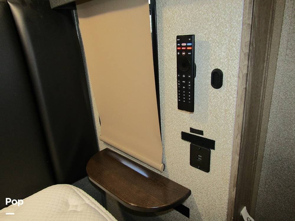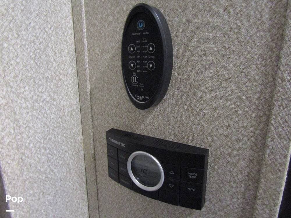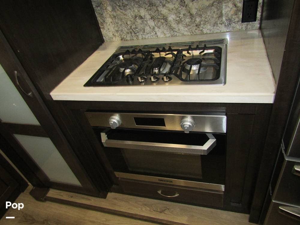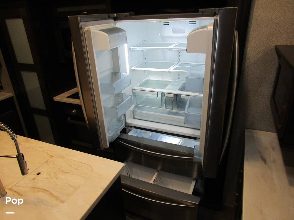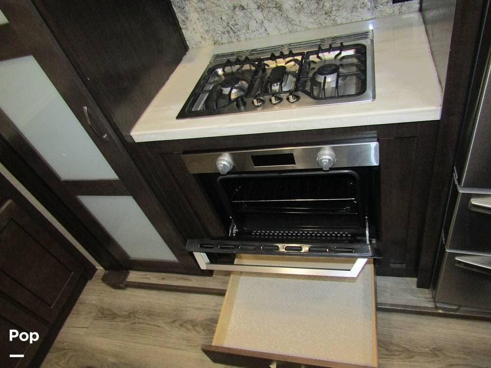 This 5th Wheel features automatic hydraulic leveling, a fireplace, LED interior and exterior lighting, modern, stylish overhead lighting, theater seating recliners with power recline, power lumbar support, and power headrest. two sleeper sofas, a fireplace, an entertainment center, and interior sunscreens.