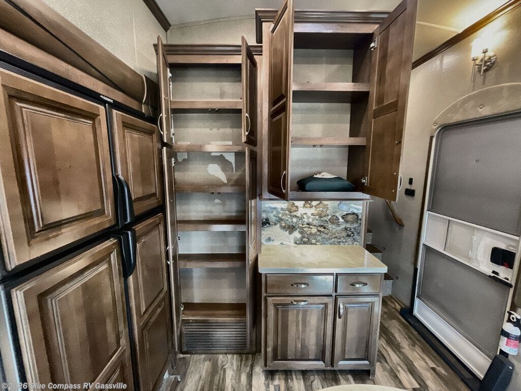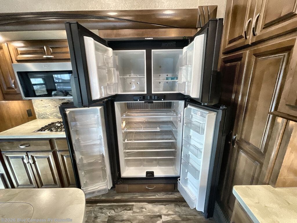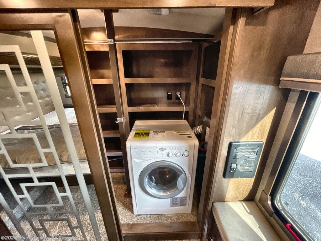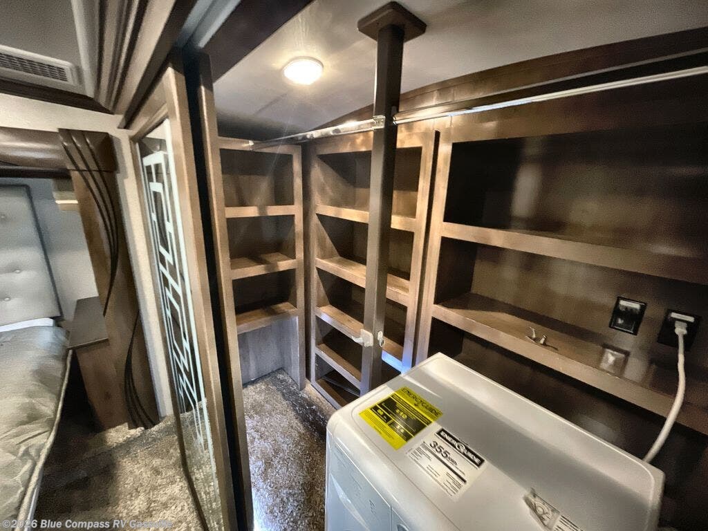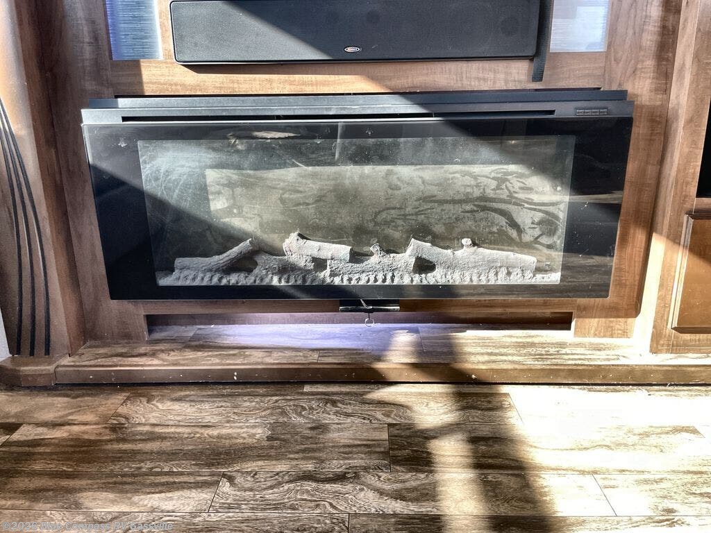This fifth wheel is the perfect couple's coach to enjoy traveling the countryside with or setting up home base for awhile longer at your favorite location. From the three spacious slide outs for increased interior space to relaxing at the theater seats while enjoying the fireplace, you will feel right at home! The kitchen island has a double sink, extra counter space, plus you can add an optional dishwasher which will speed up the clean-up process. Enjoy your meals at the free-standing dinette, and at night head up the stairs to the private front bedroom where you will find a king-size bed, a full-length wardrobe for your hang-up clothes, plus there is a spot that has been prepped for a washer and dryer so that you can easily keep up with the laundry while you are away from home!