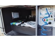The trailer has electric levelers and lots of exterior storage space on the exterior.