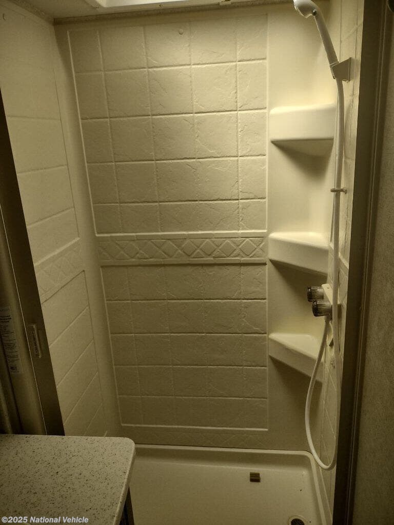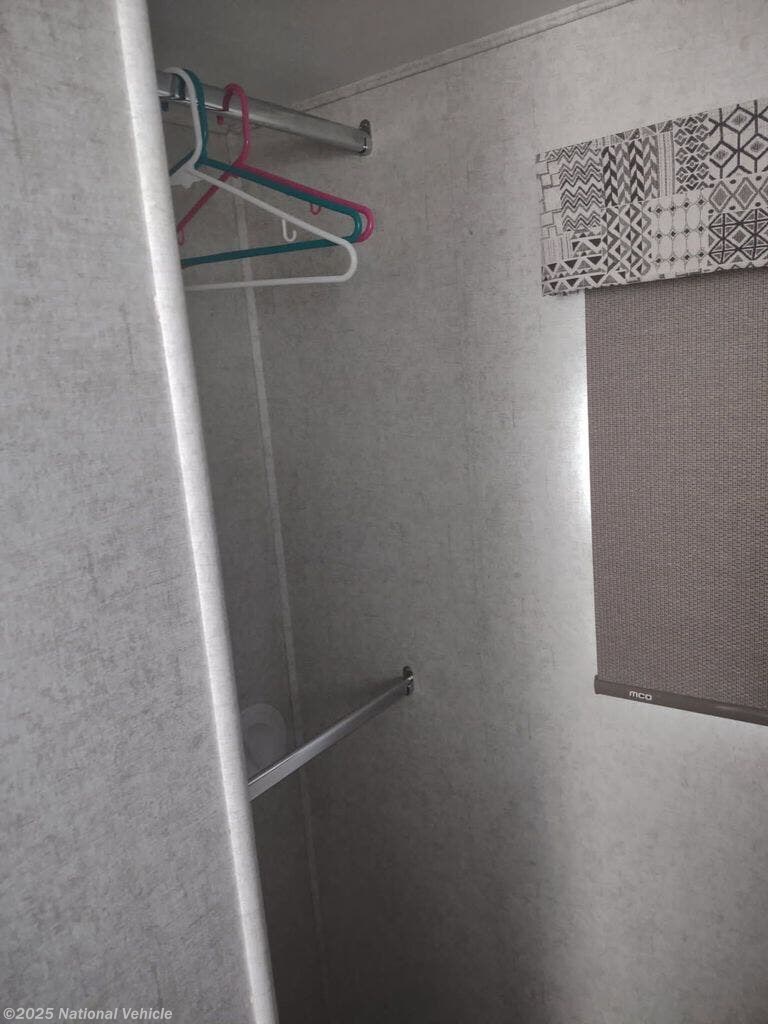 The spacious interior features a dual-slide layout that maximizes living space, complete with a U-shaped dinette, and a queen-size bed in the rear bedroom. Enjoy the convenience of a fully equipped kitchen with a three-burner cooktop, microwave, refrigerator, and ample storage throughout. The full bathroom includes a corner shower, vanity, and toilet, offering all the comforts of home wherever you roam.