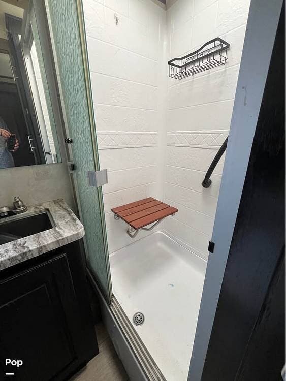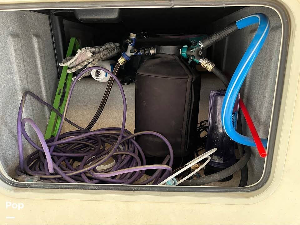 There is a TV, awning, speakers, and a shower, along with plenty of storage.