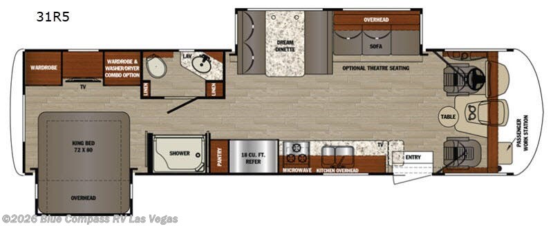 Load up your family of five and see just how easy it is to camp in style and comfort with this Georgetown 5 Series 31R5 class A gas motorhome. Sleeping room can be found at the sofa, the dream dinette, and the king bed. Inside the rear private bedroom, you will also find two wardrobes, one of which is prepped to add the optional washer/dryer so that you can keep up with your laundry throughout your trip, and there is even a 32" LED TV. The front passenger work station makes it easy to get a little work done while you are away from home too. In the kitchen you will find all of the amenities needed to create your favorite meals for your family while you are away from home. There is an 18 cu. ft. stainless steel refrigerator, a three-burner range, plus a microwave and plenty of overhead cabinets throughout to keep all of your cooking/traveling necessities!