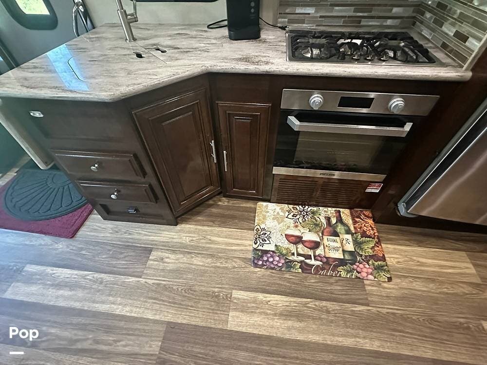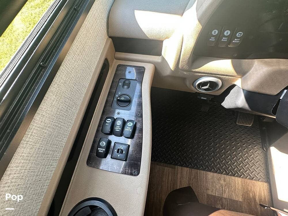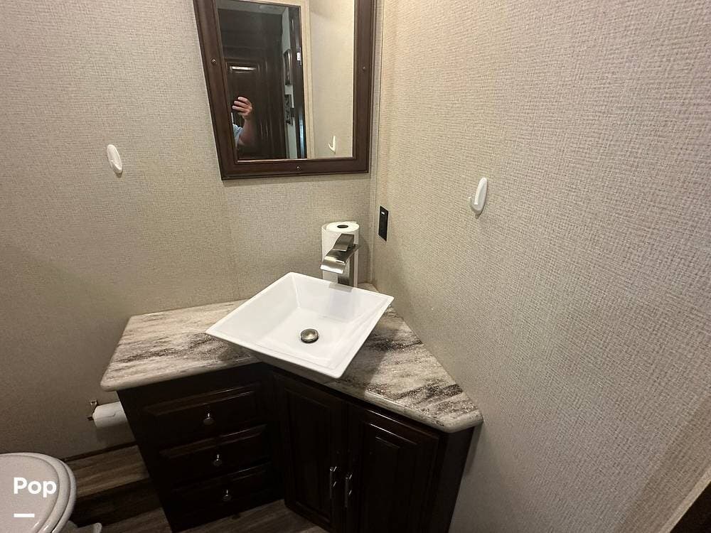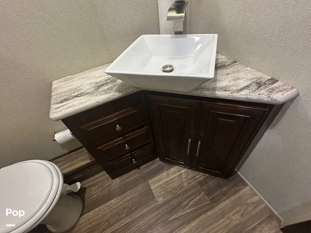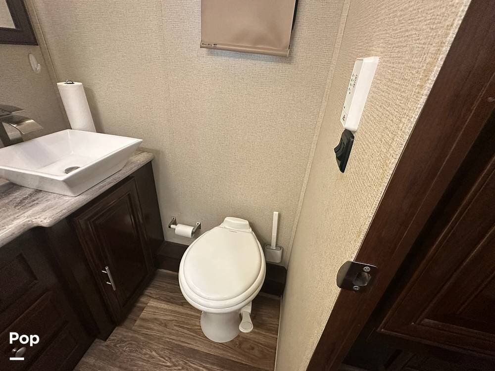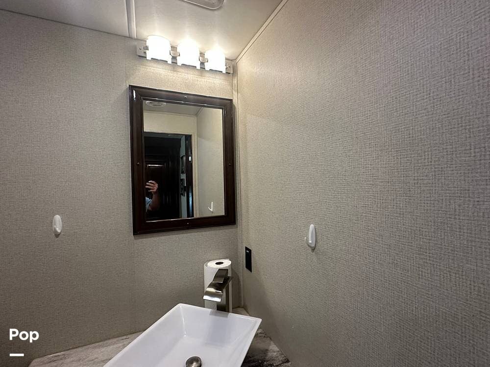 Inside, thanks to the massive slide-out, there's more than enough room to entertain while preparing a great meal. A bonus to this rig is the half bath off the living area. There's no need for everyone to walk through the master bedroom to use the bathroom.