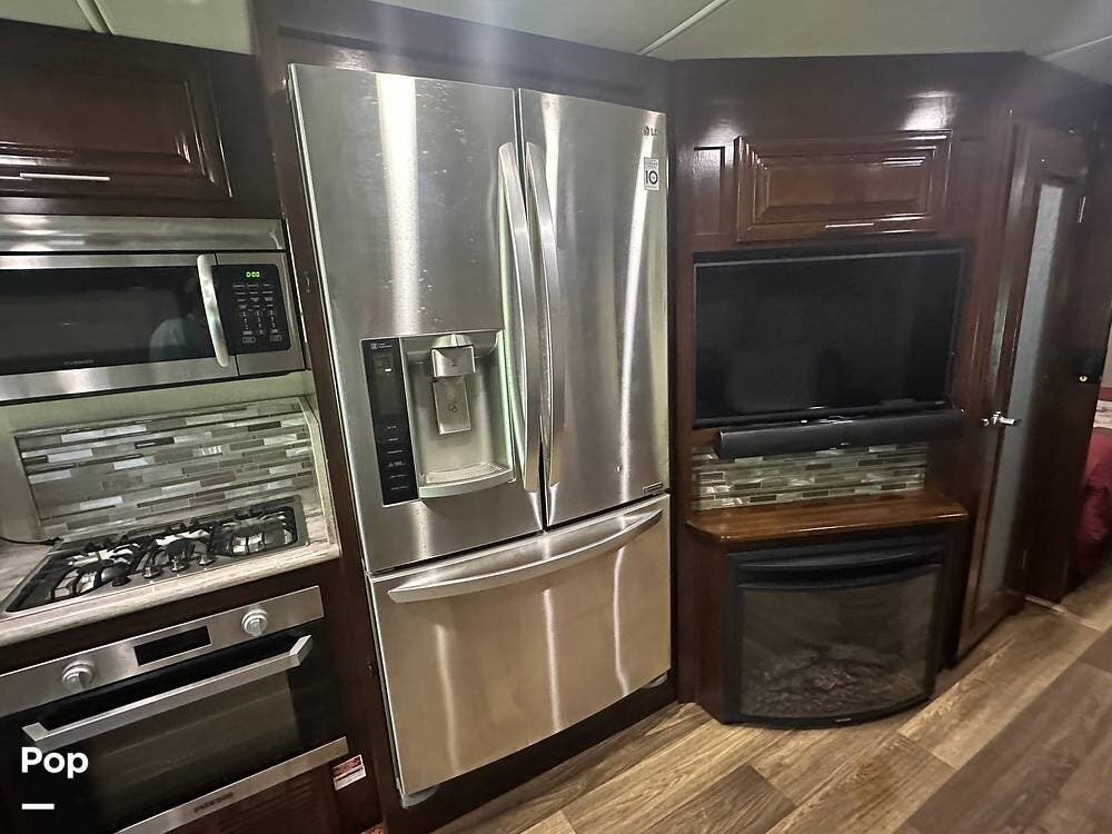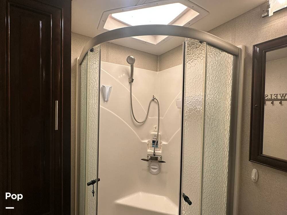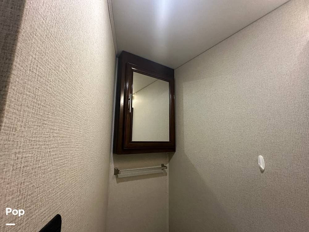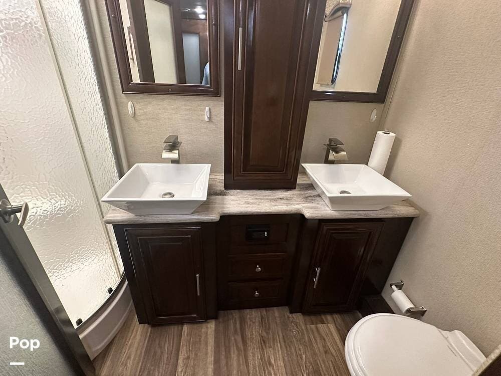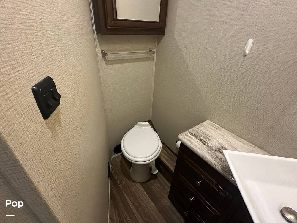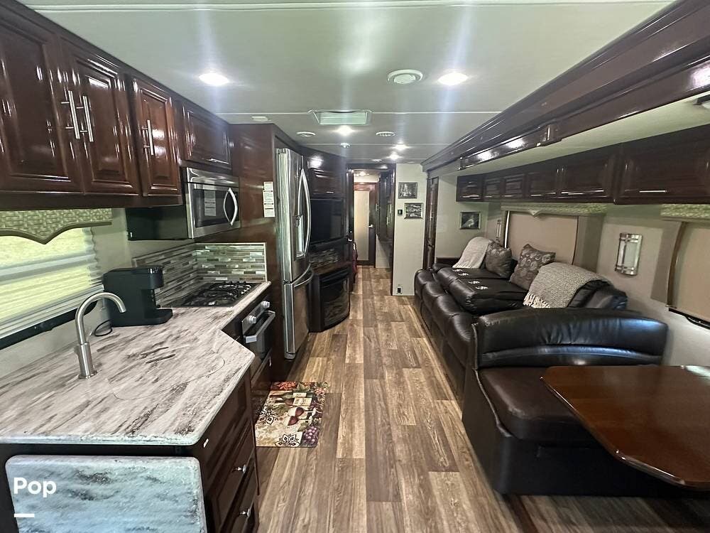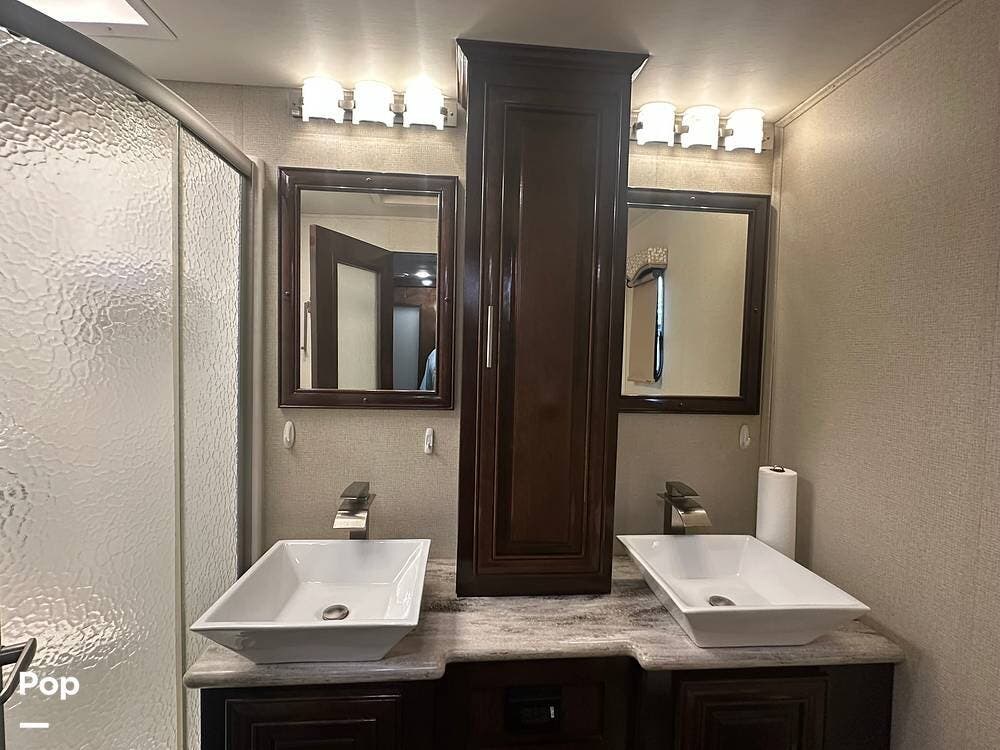 Inside, thanks to the massive slide-out, there's more than enough room to entertain while preparing a great meal. A bonus to this rig is the half bath off the living area. There's no need for everyone to walk through the master bedroom to use the bathroom.