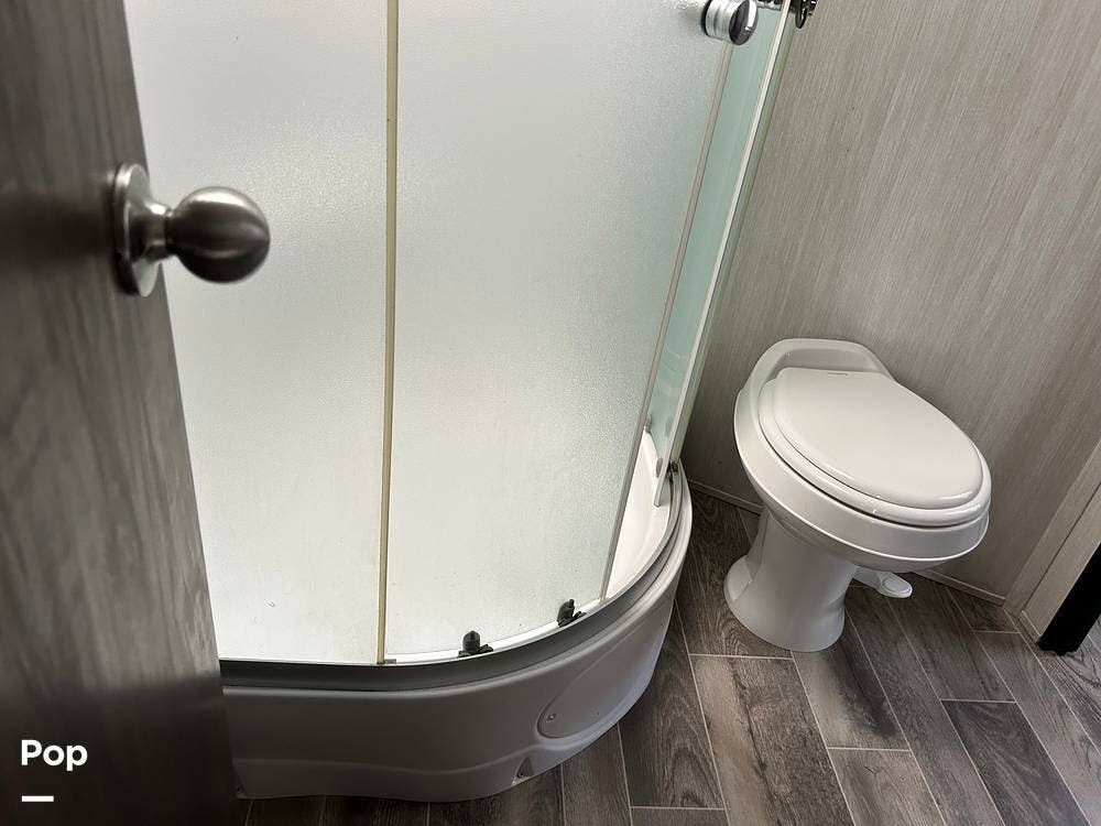 There's a bathroom with a shower, toilet, and vanity tucked in the middle of the unit for convenience.