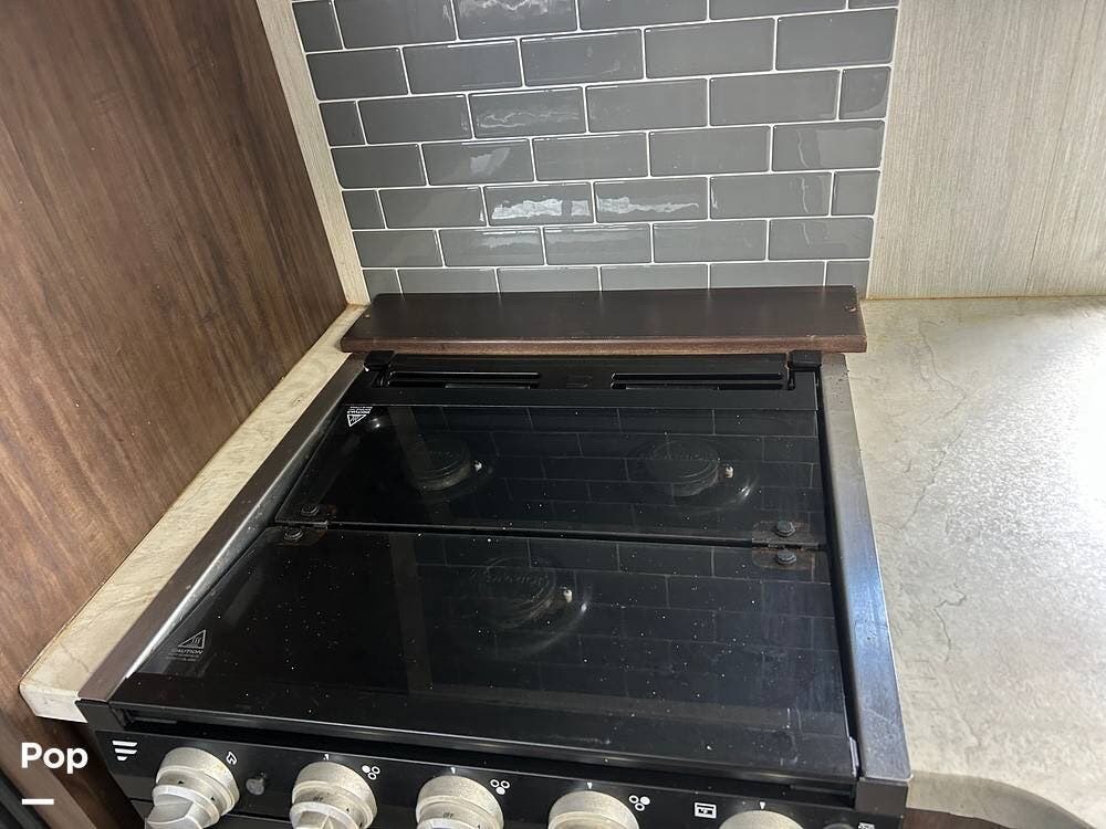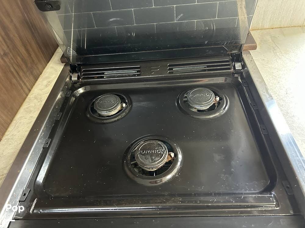 The main living area includes a dinette and sofa for hanging out, plus a full kitchen with a three-burner stove, microwave, oven, and refrigerator so you can cook real meals instead of living off camp food.